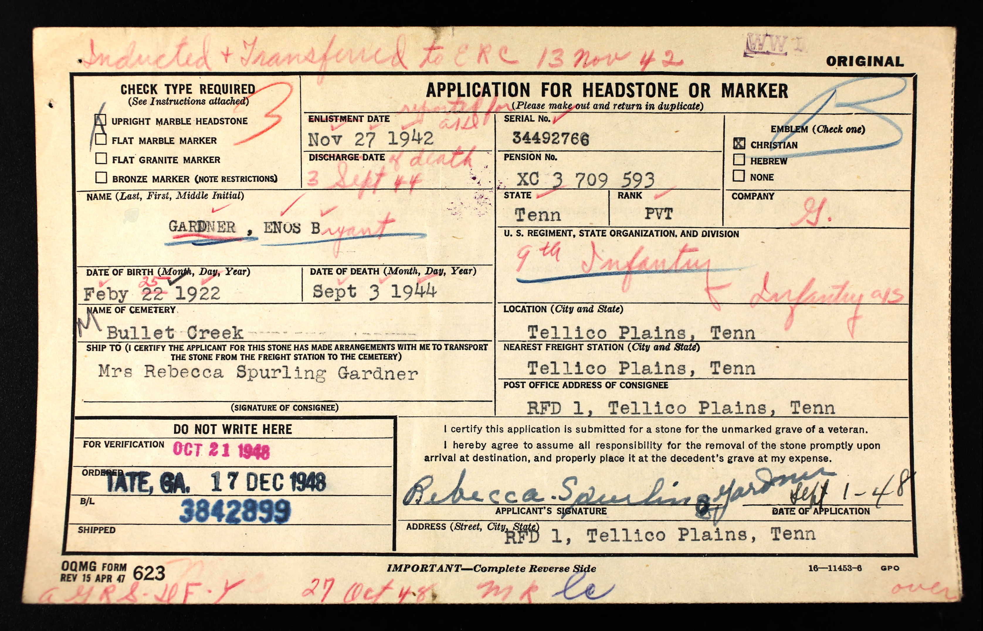 Private Gardner was killed in action in France on September 3, 1944. He is buried at Bullet Creek Cemetery.