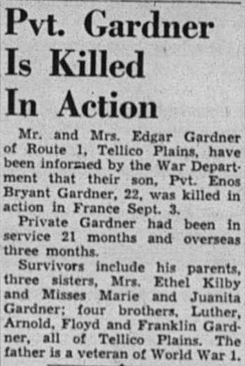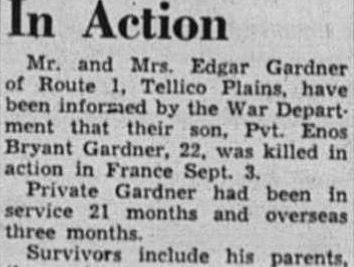 Funeral Services were held on Sunday, July 18 at Bullet Creek Church for Enos B. Gardner, who was killed in action in France on Sep. 3, 1944. Revs. Brackett and Hampton conducted the services. The song service was furnished by the M… Quartet of Athens. The American Legion was in charge of the service at the graveside.