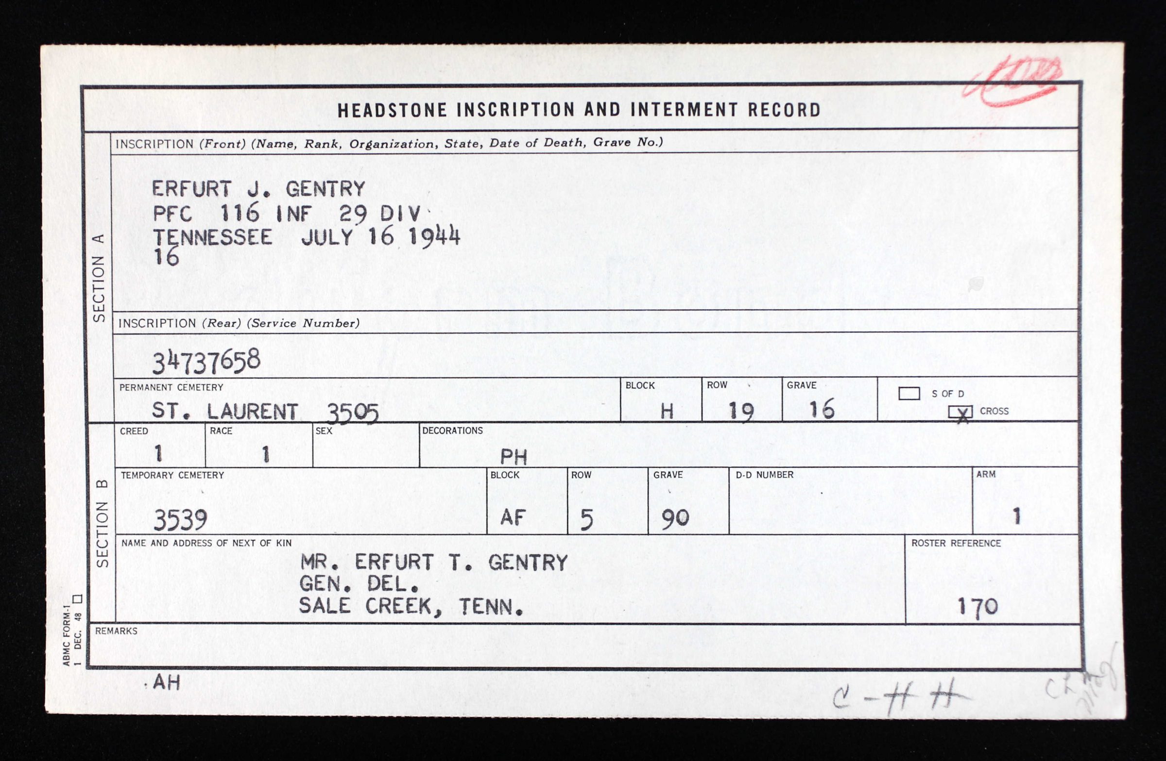 Private First Class Erfurt J. Gentry #34737658 US Army was assigned to the 116th Infantry Regiment, 29th Infantry Division. The 29th ID in July 1944 was involved in the Normandy Campaign around St-Lo.