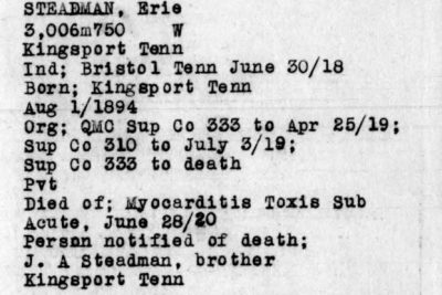 Erie Steadman left Kingsport in June, 1918. He sailed for France October 14 and was attached to the quartermaster corps. He returned to America November 15, 1919, suffering from tuberculosis, and died in hospital at Camp Gordon June 28.