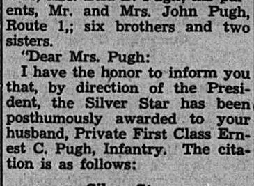I have the honor to inform you that, by direction of the President, the Silver Star has been posthumously awarded to your husband, Private First Class Ernest C. Pugh, Infantry. The citation is as follows: