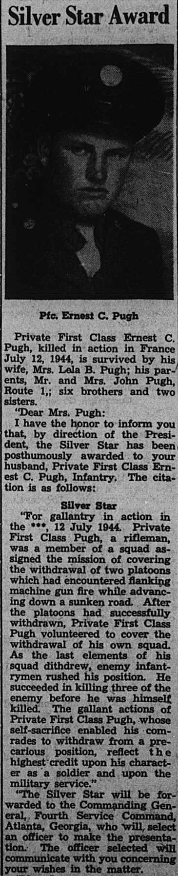 Private First Class Ernest C. Pugh, killed in action in France July 12, 1944, is survived by his wife, Mrs. Lola B. Pugh; his parents, Mr. and Mrs. John Pugh, Route 1; six brothers and two sisters.