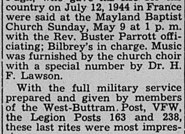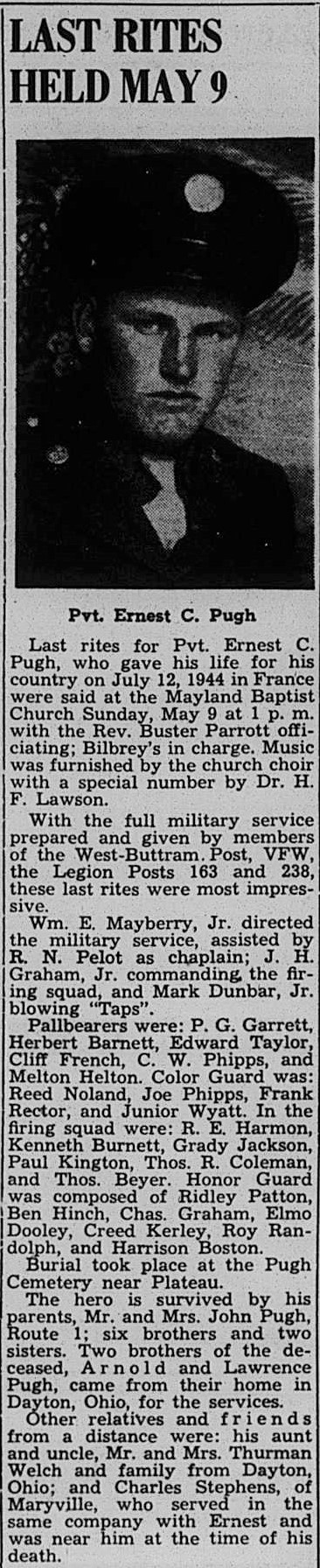 Last rites for Pvt. Ernest C. Pugh, who gave his life for his coutry on July 12, 1944 in France were said at the Mayland Baptist Church. With the full military service prepared and given by members of the West-Buttram Post, VFW, the Legion Post 163 and 238, these last rites were most impressive.