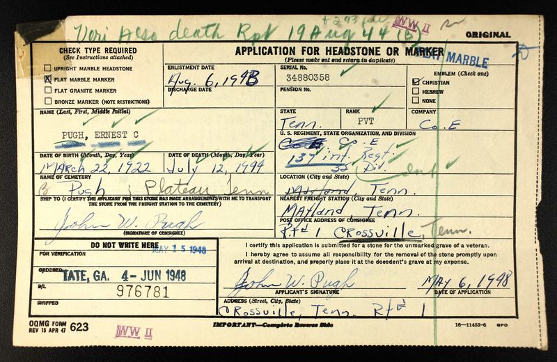 - Burial/Memorial Location: Pugh Cemetery, Plateau, TN