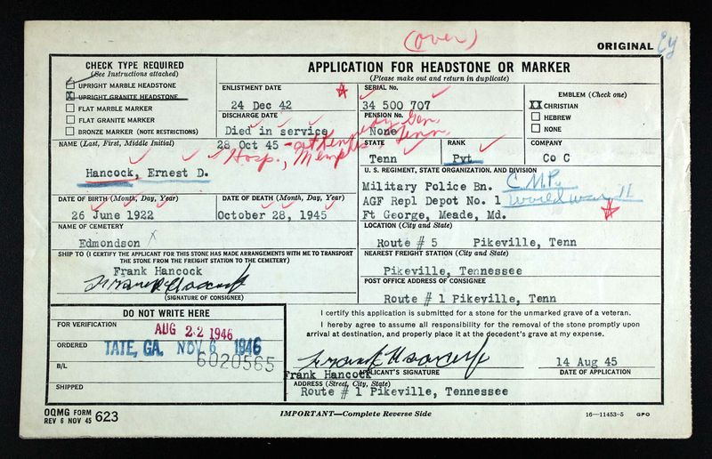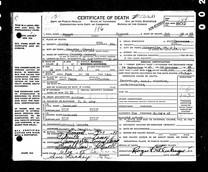 He died in service on 28 October 1945 at the Kennedy General Hospital in Memphis (Rural), Shelby County. He stayed in the hospital from 14 September till 28 October 1945 and died due to Hemorrhage, nasal, superior, post-traumatic.