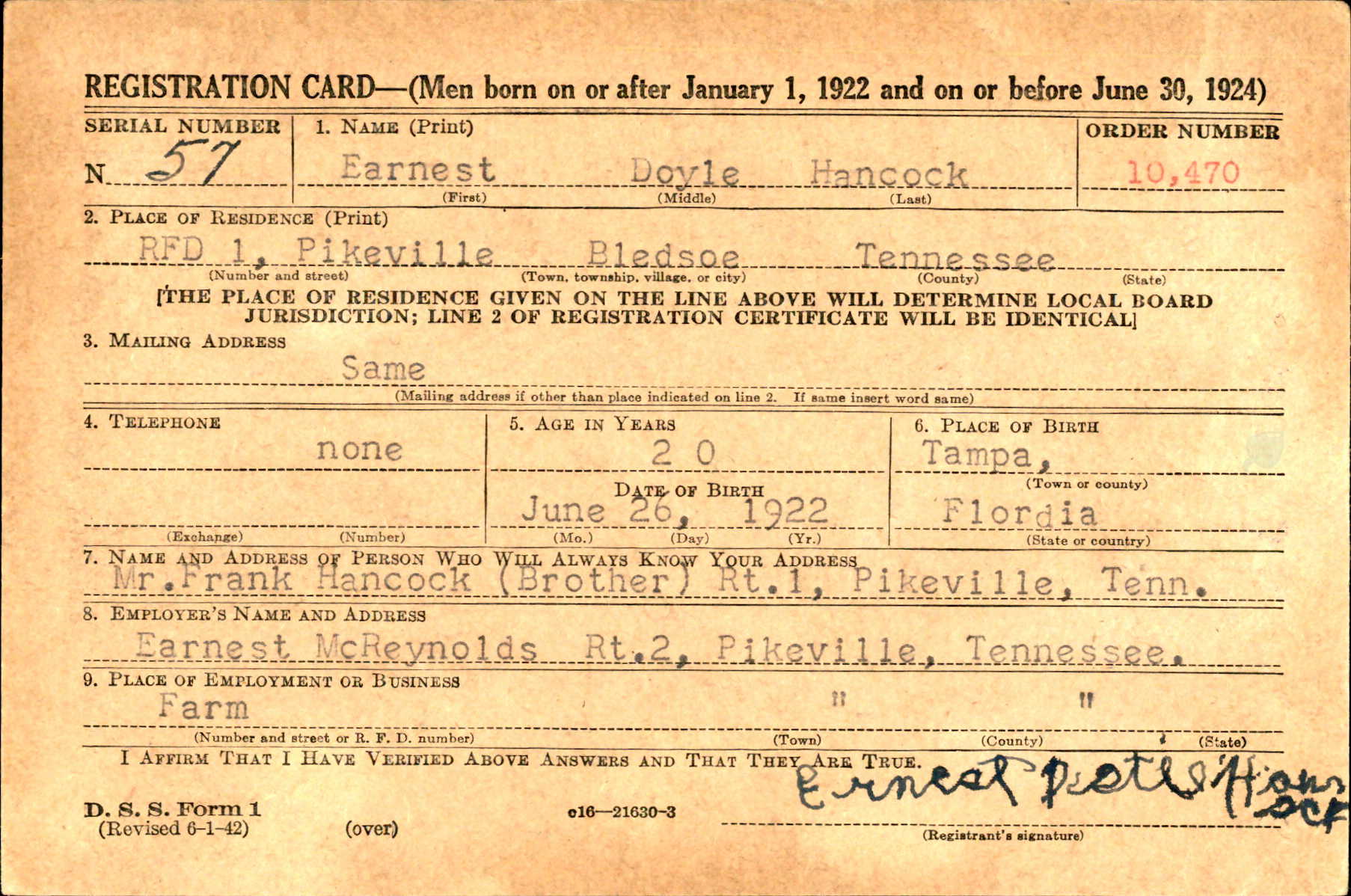 Ernest Doyle Hancock was born on 26 June 1922 at Tampa, Florida, the son of Samuel Emerson Hancock and Ollie Johnson.