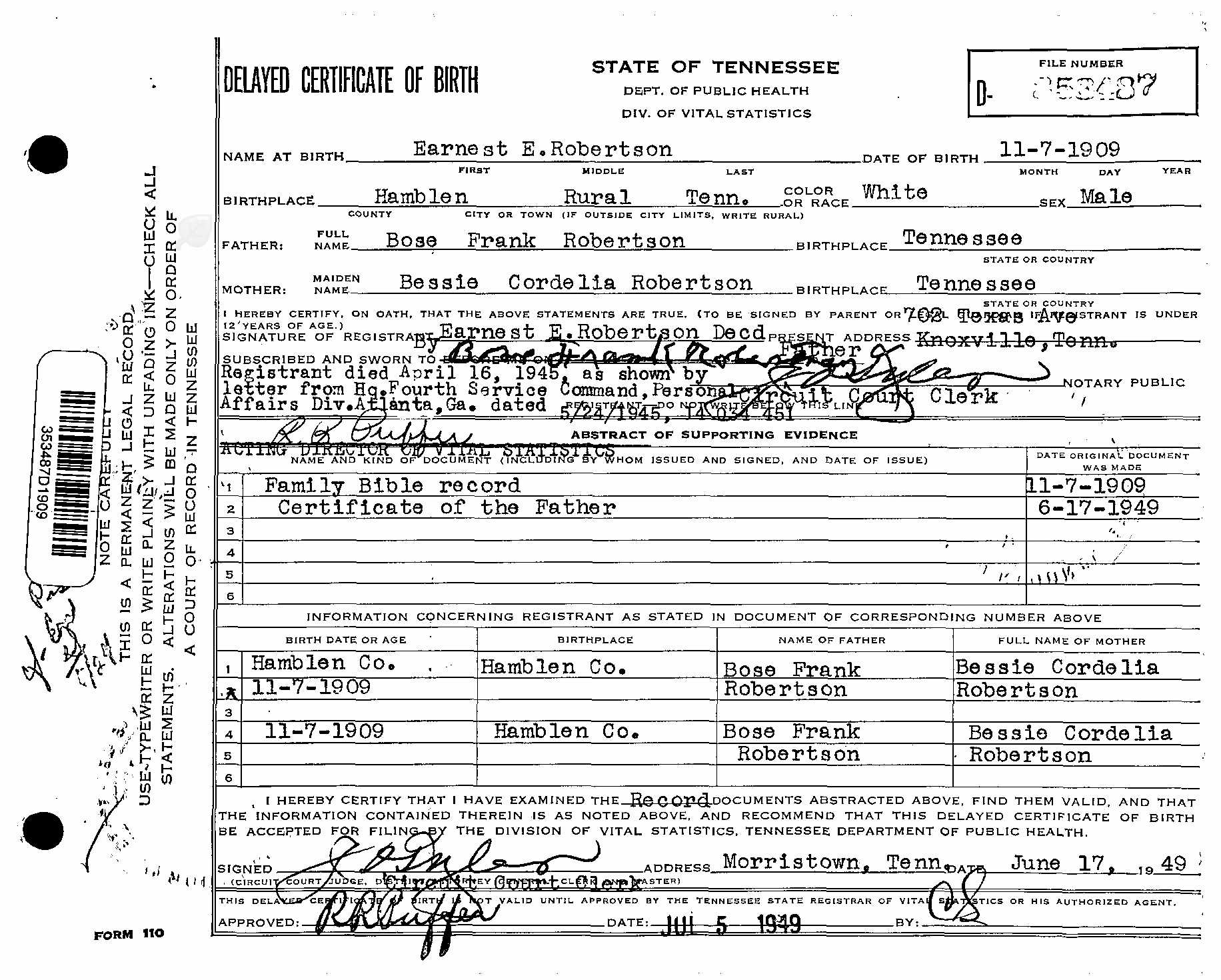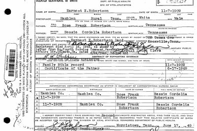 Ernest Edward Robertson was the son of Bose Frank Robertson and Bessie Cordelia Robertson.
