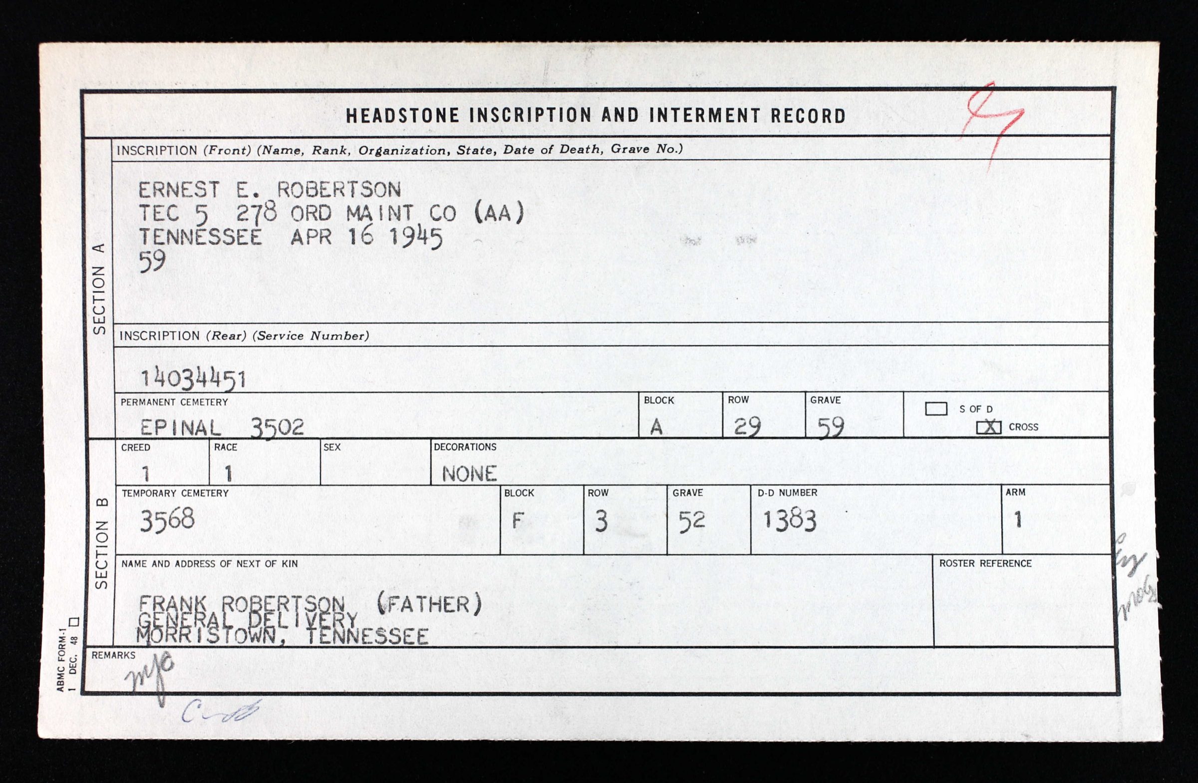 Ernest Robertson was initially buried at Solers Cemetery at Melun, France, and reburied at Epinal American Cemetery, Epinal (Vosges), France, A, 29, 59