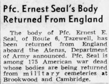 The body of Pfc. Ernest E. Seal, of Route 6, Tazewell, has been returned from England aboard the Atenas, Department of Army announced. Pfc. Seal is among 175 American war dead whose bodies are being returned from military cemeteries at Brookwood and Cambridge.