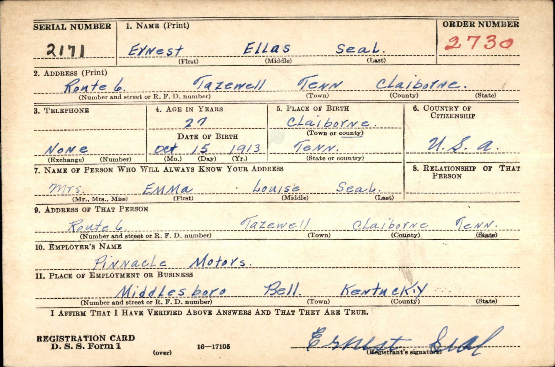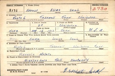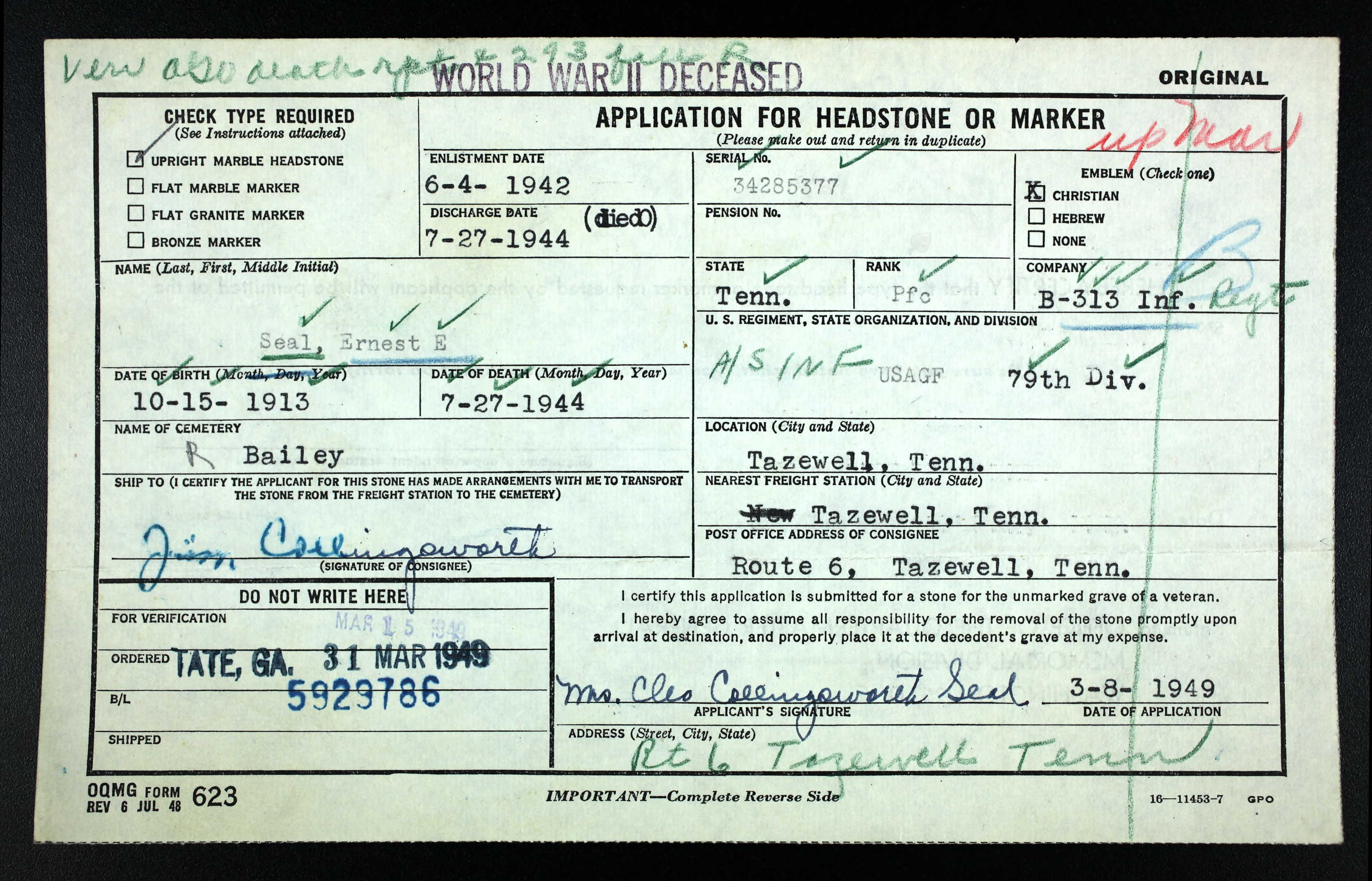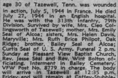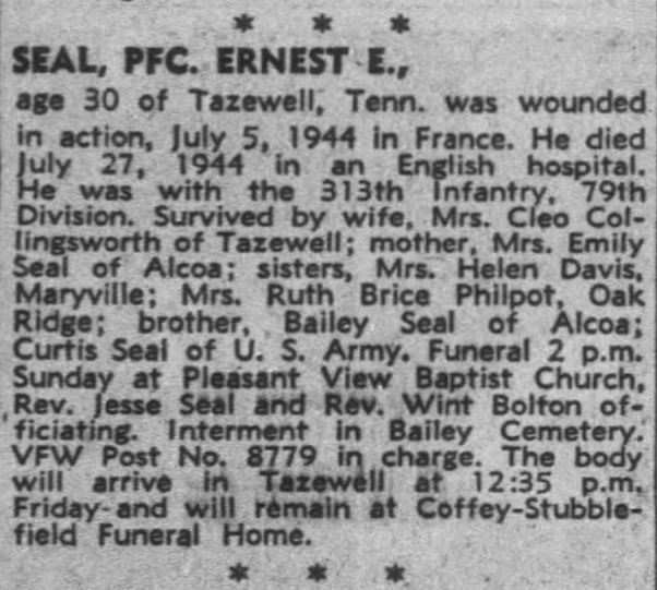 Ernest Ellas Seal was born on 15 October 1913 to George Washington Seal and Emily L. Seal. He was married to Cleopatra “Cleo” Collingsworth. He was wounded in action on July 5, 1944 in France and died July 27, 1944 in a hospital in England.