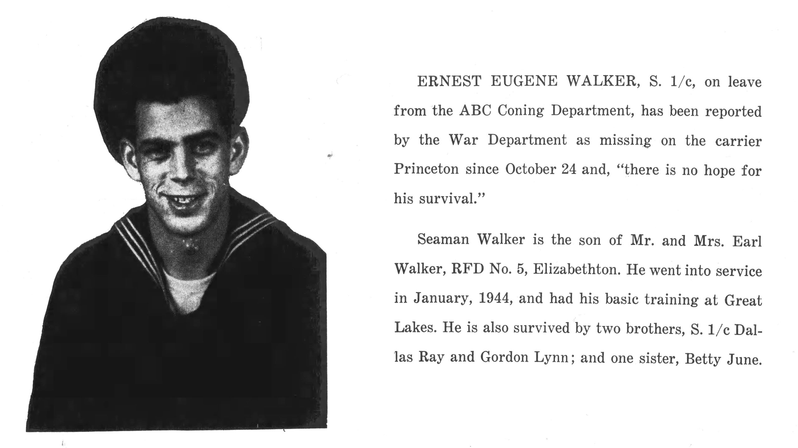 Ernest Walker served on the U.S.S. Princeton (CVL23)