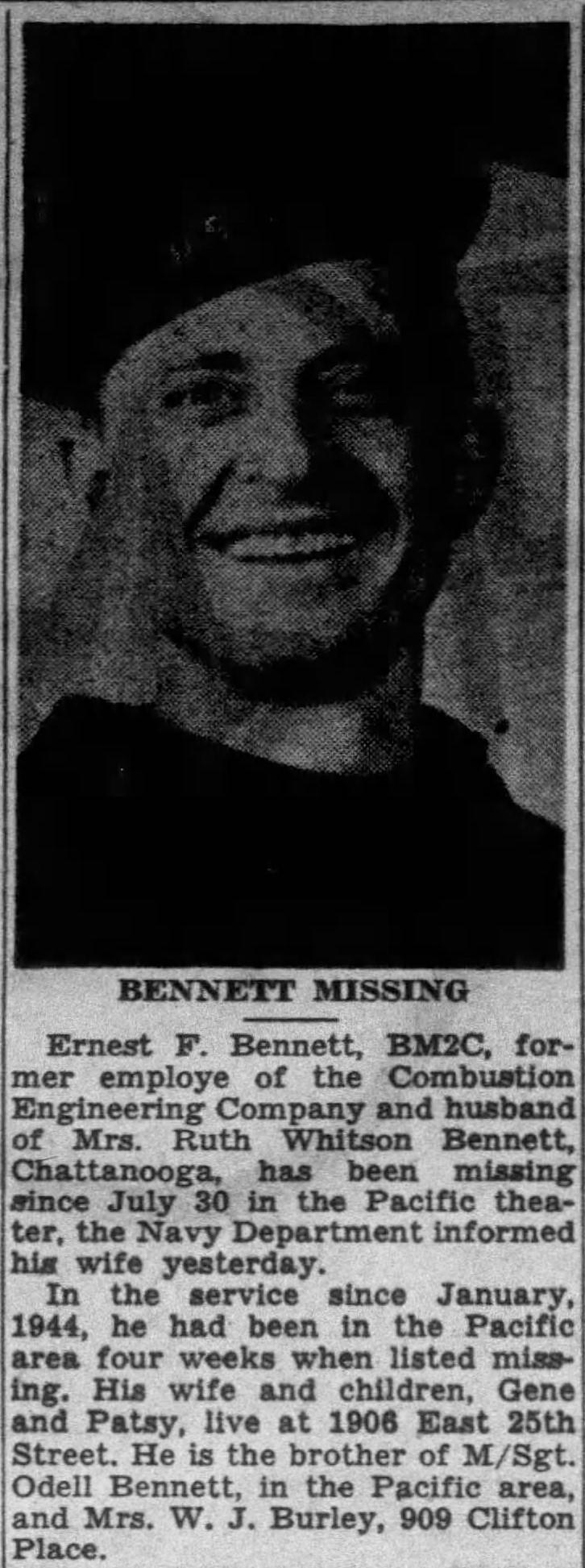 Ernest F. Bennett, BM2C, former employe of the Combustion Engineering Company and husband of Mrs. Ruth Whitson Bennett, Chattanooga, has been missing since July 30 in the Pacific theater, the Navy Department informed his wife yesterday. In the service since January 1944, he had been in the Pacific area four weeks when listed missing. His wife and children, Gene and Patsy, live at 1906 East 25th Street. He is the brother of M/Sgt. Odell Bennett, in the Pacific area, and Mrs. W.J. Burley, 909 Clifton Place.