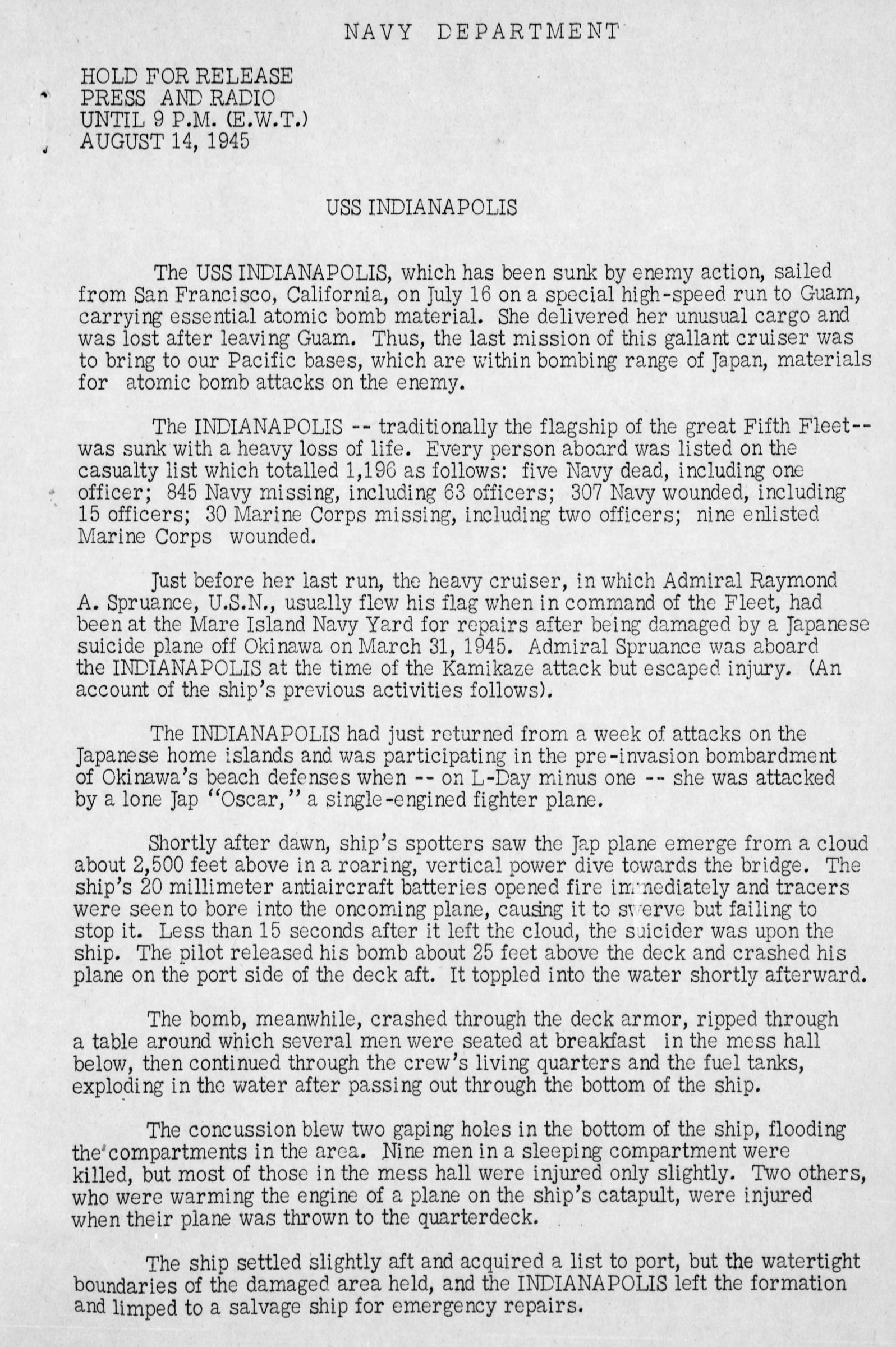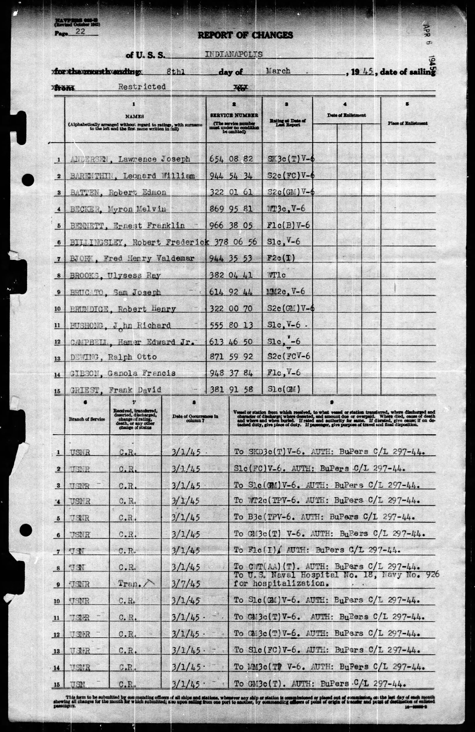 He was killed in action aboard USS Indianapolis (CA-35). After the ship delivered the atomic bomb to Tinian Island, it was hit by torpedoes from Japanese submarine I-58, 30 July 1945, in transit to return to the fleet.