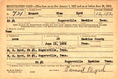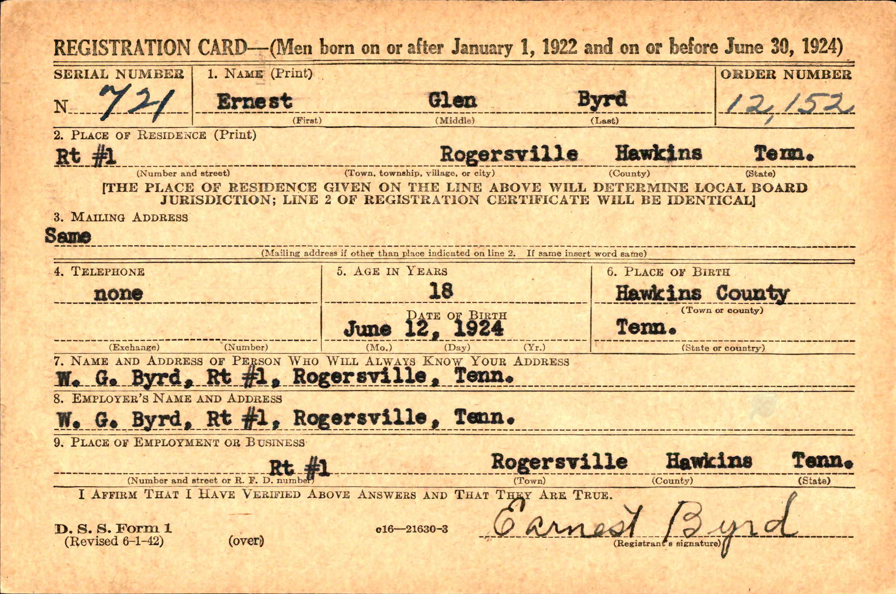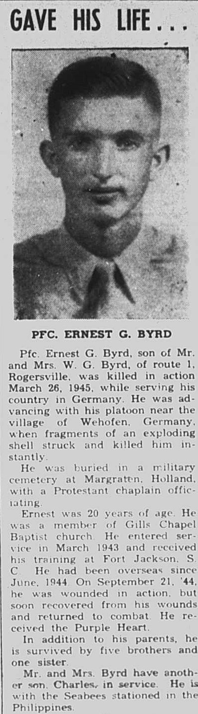 Pfc. Ernest G. Byrd, son of Mr. and Mrs. W.G. Byrd, of route 1, Rogersville, was killed in action March 26, 1945, while serving his country in Germany. He was advancing with his platoon near the village of Wehofen, Germany, when fragments of an exploding Shell struck and killed in instantly.