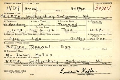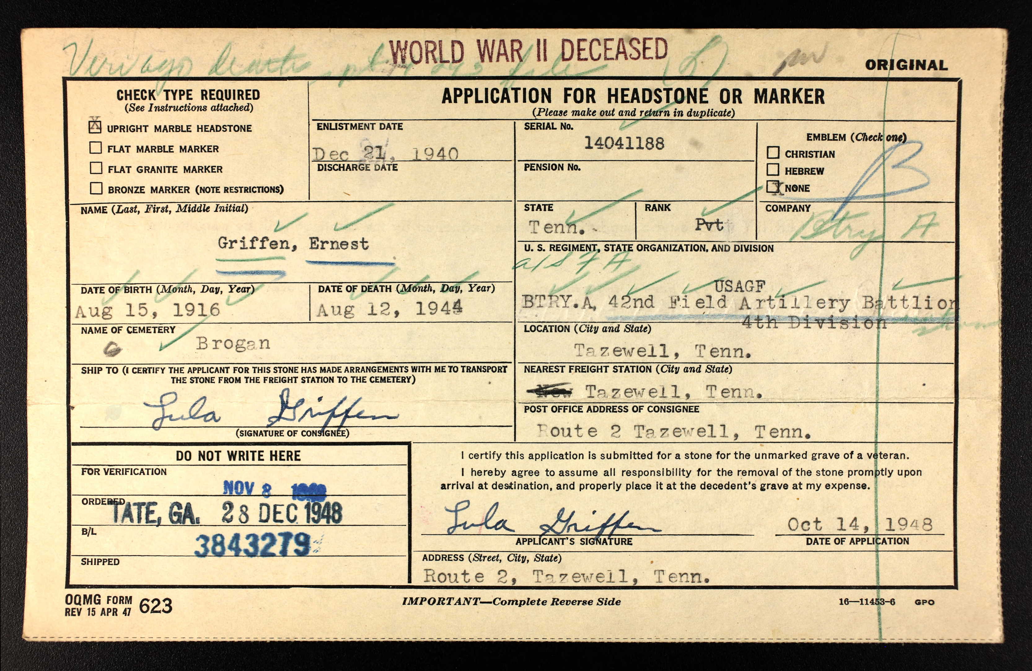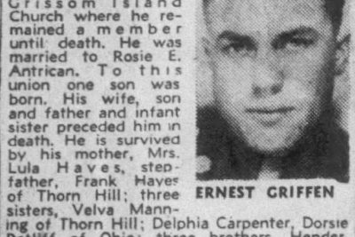 Pfc. Ernest Griffin, son of Mr. and Mrs. Joe Griffen. Born Aug. 15, 1916 in Claiborne County. He enlisted in U.S. Army, Dec. 21, 1941, serving with Heavy Artillery when he was killed in action in France, Aug. 12, 1944. He professed faith in Christ at Grissom Island Church where he remained a member until death. He was married to Rosie A. Antrican. To this union one son was born. His wife, son and father and infant sister preceded him in death. He is survived by his mother, Mrs. Lula Haves, stepfather, Frank Hayes of Thorn Hill; three sisters, Velva Manning of Thorn Hill; Delphia Carpenter, Dorsie Ratliff of Ohio; three brothers, Henderson Griffen of Tazewell; Robert and Clarence Griffen of Ohio.