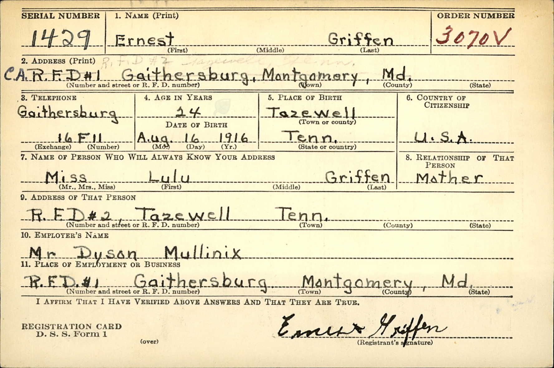 Ernest Griffen was born at Tazewell, Tennessee, the son of Joseph “Joe” Griffen and Lula Brogan.