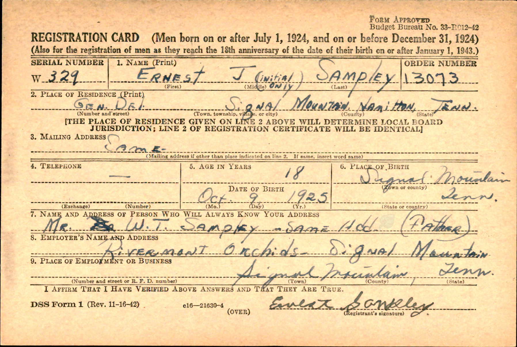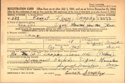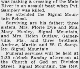 Pvt. Ernest J. Sampley, 18, son of W.T. Sampley, Dvivion Street, Signal Mountain, was killed in action in Germany March 28, 1945. His body will arrive in Chattanooga this morning. His company had crossed the Rhine into central Germany and was making a crossing of the Main River in an assault boat when Pvt. Sampley was killed. He attended the Signal Mountain School. Surviving are his father: three sisters, Mrs. Florie Dye and Mrs. Mary Hunley, Signal Mountain, and Mrs. Helen Outlaw, Gainesville, Fla., and three brothers, Andrew, Martin and W.C. Sampley, Signal Mountain.