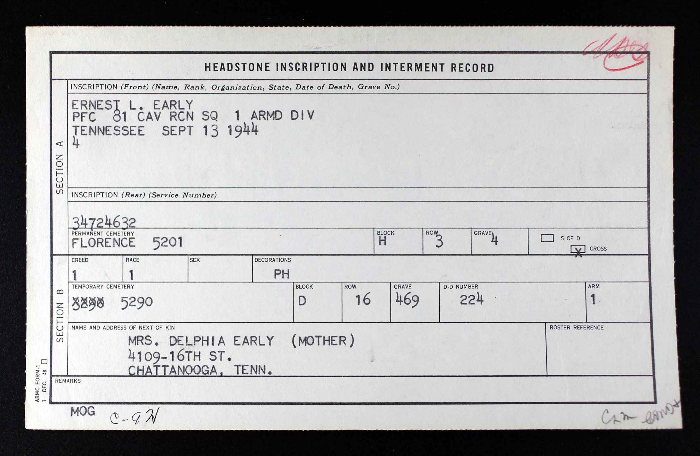 Pfc. Ernest L. Early, 20, son of Mr. and Mrs. Abe Early, 4109 16th Avenue, a former student of East Lake School and a former employe of Temple Brothers Furniture Company, was reported killed in action in Italy, Sept. 13. Pfc. Early is survived by five older brothers, two of whom are also in the service. They are Cpl. Murrell Early, stationed in Corsica; Pfc. Joe Ode Early, stationed at Camp Knight, Calif., and Frank William and Edward Early; three sisters, Mrs. Gertrude Kilgore, Mrs. Lula Bell Carnes and Mrs. Louise Dunn, and his parents.
