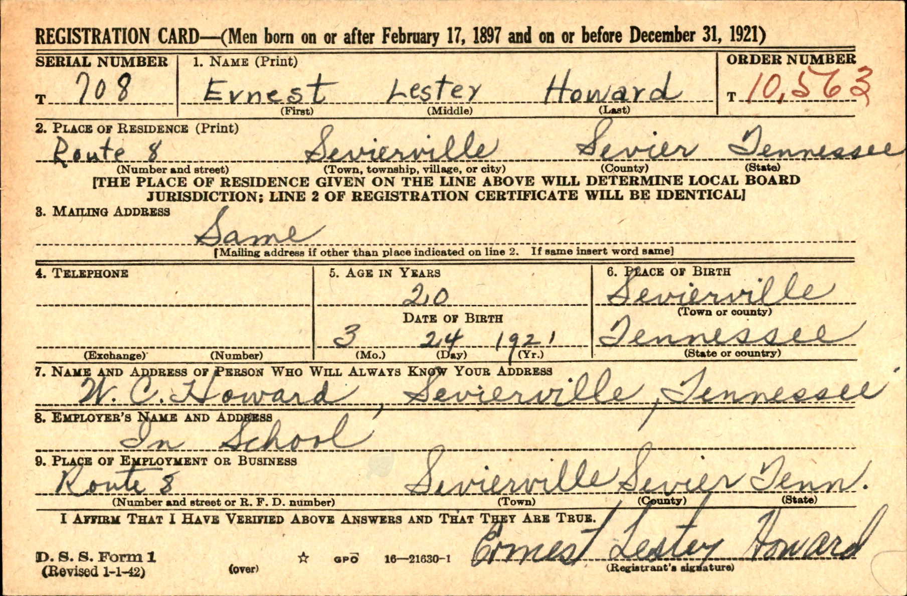 Ernest Lester Howard was born in Sevierville, Tennessee. He was the son of Wilson Crockett Howard and Josie Lee Emert. He was married to Margie Jo Walden.