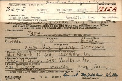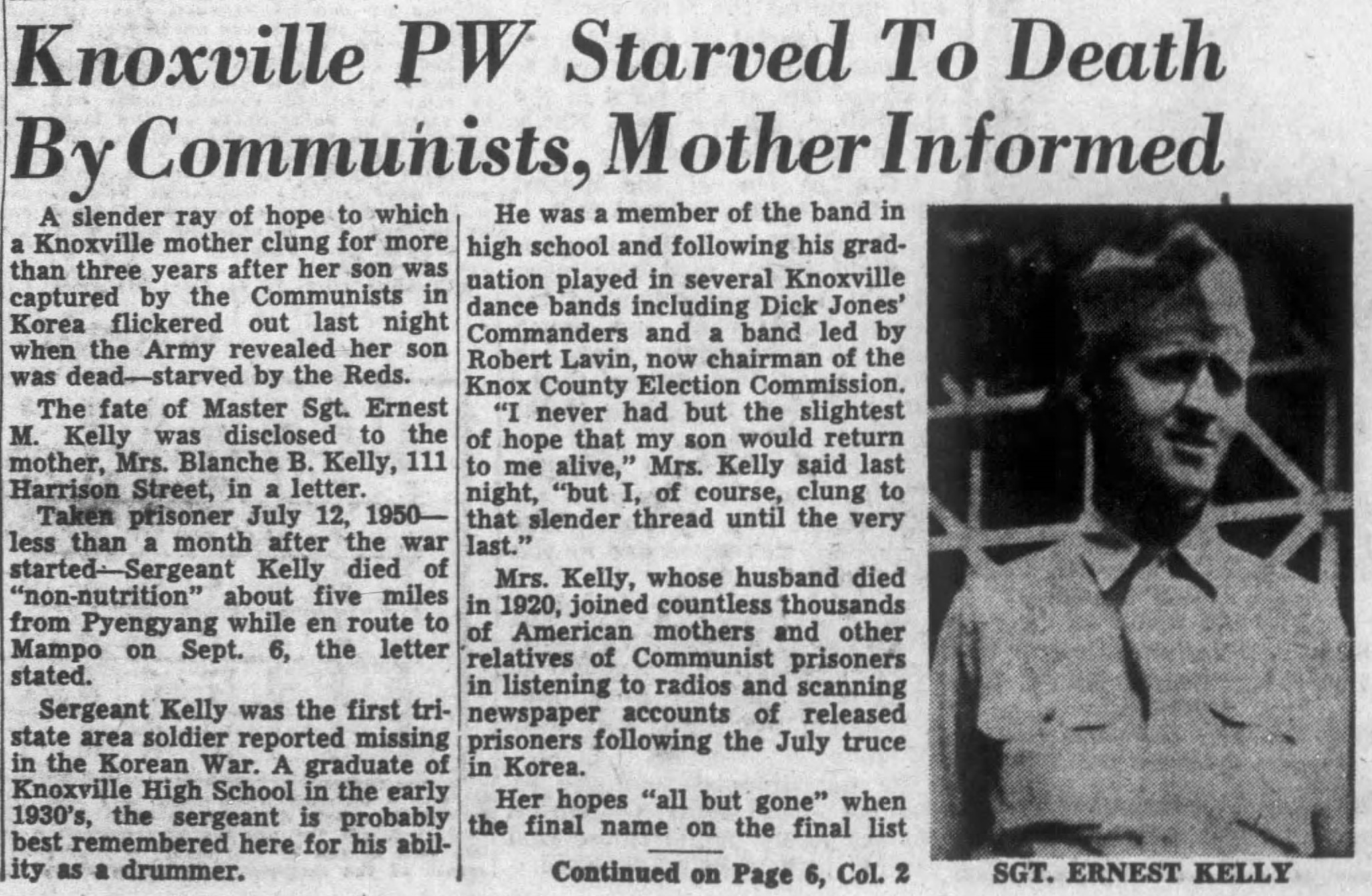 A slender ray of hope to which a Knoxville mother clung for more than three years after her son was captured by the Communists in Korea flickered out last night when the Army revealed her son was dead, starved by the Reds. The fate of Master Sgt. Ernest M. Kelly was disclosed to the mother, Mrs. Blanche B.Kelly, 111 Harrison Street, in a letter. Taken prisoner July 12, 1950 – less than a month after the war started – Sergeant Kelly died of “non-nutrition” about five miles from Pyengyang while en route to Mampo on Sept. 6, the letter stated. Sergeant Kelly was the first tri-state area soldier reported missing in the Korean War. A graduate of Knoxville High School in the early 1930’s, the sergeant is probably best remembered here for his ability as a drummer. He was a member of the ban in high school and following his graduation played in several Knoxville dance bands including Dick Jones’ Commanders and a band led by Robert Lavin, now chairman of the Knox County Election Commission. “I never had but the slightest of hope that my son would return to me alive,” Mrs. Kelly said last night, “but I, of course, clung to that slender thread until the very last.”