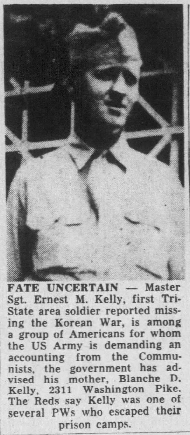 Master Sgt. Ernest M. Kelly, first Tri-State are soldier reported missing in Korean War, is among a group of Americans from whom the US Army is demanding an accounting from the Communists, the governmernt has advised his mother, Blanche D. Kelly, 2311 Washington Pike. The Reds say Kelly was one of several PW’s who escaped their prison camps.