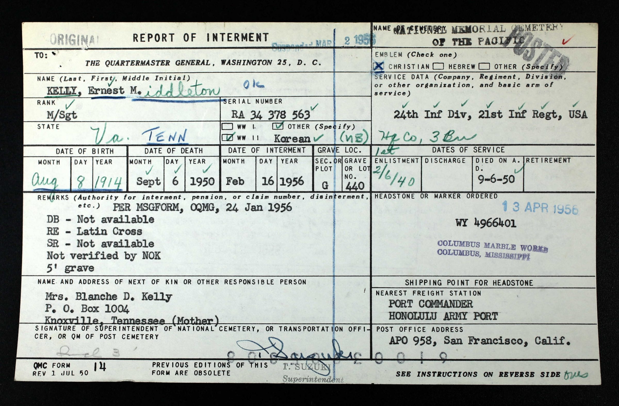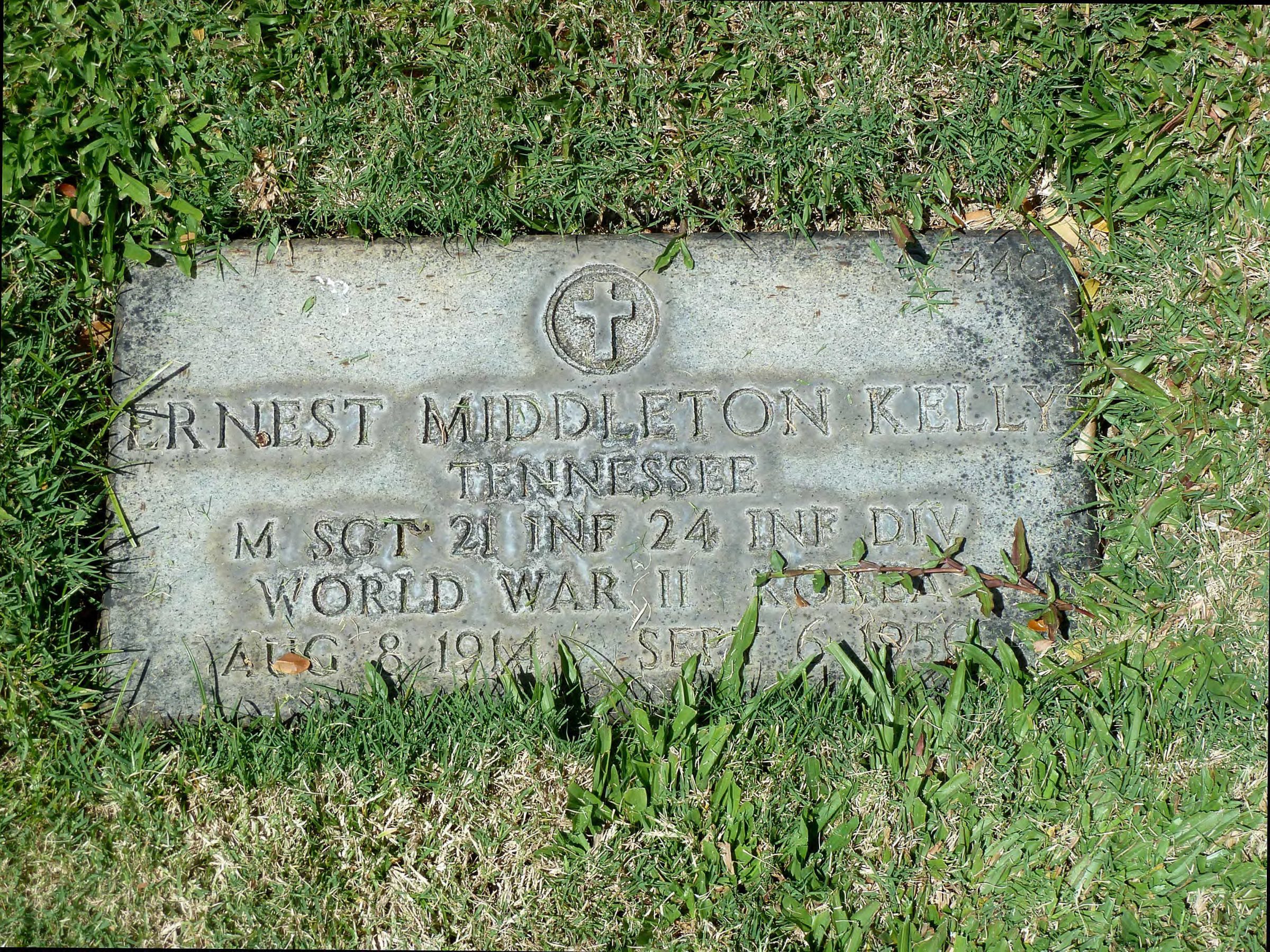 Master Sergeant Ernest Middleton Kelly, from Knoxville, was born on August 8, 1914 to Ernest Middleton Kelly Sr. and Blanche Grace Douglass. He was the brother of Sgt. Maj. Jeffrey D. Kelly, who also died in the line of duty. Sergeant Kelly was a member of the 21st Infantry Regiment, 24th Infantry Division. He was taken Prisoner of War while fighting the enemy near Chochiwon, South Korea on July 12, 1950, forced to march to North Korea on the “Tiger Death March”, and died while on a train to Manpo, North Korea on September 6, 1950.