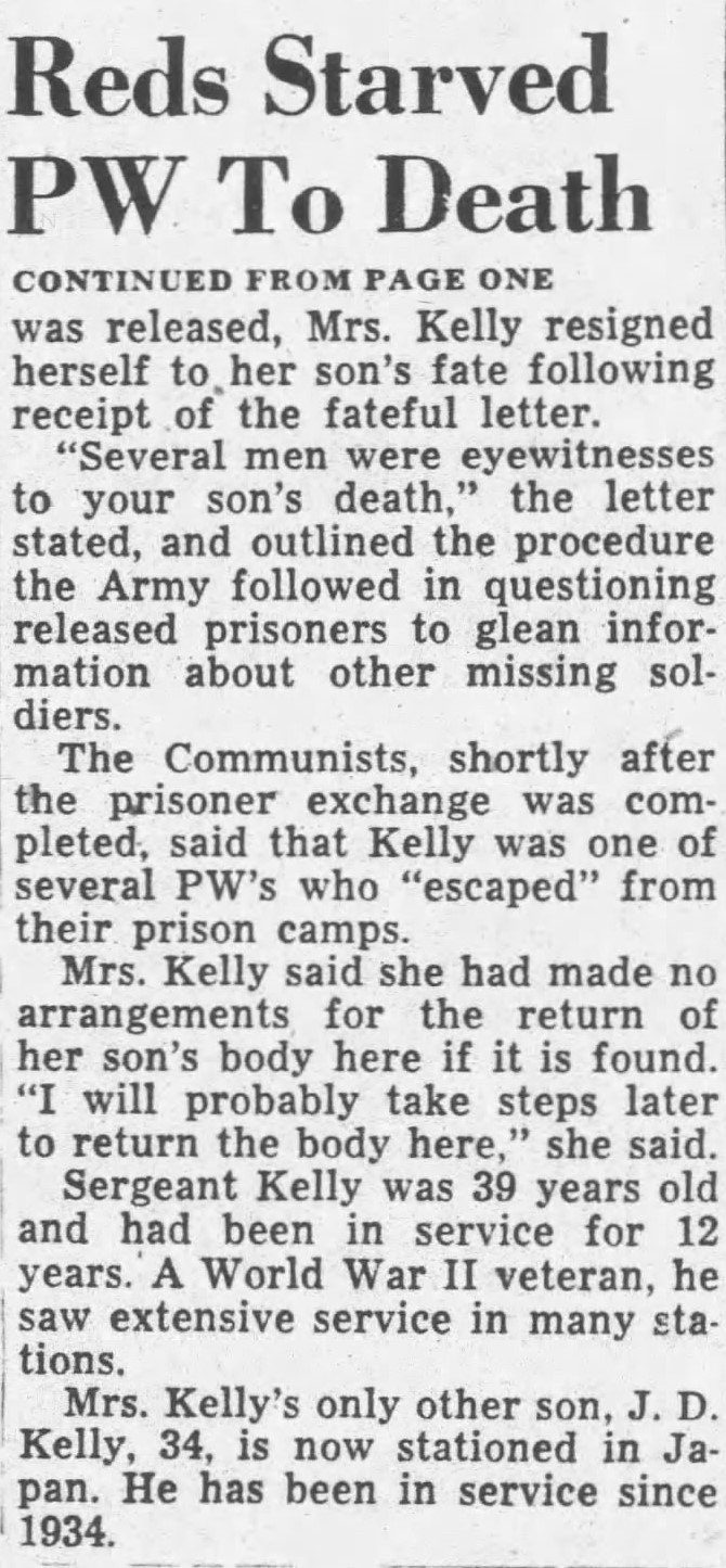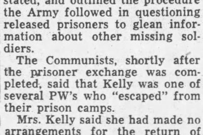 Mrs. Kelly, whose husband died in 1920, joined countless thousands of American mothers and other relatives of Communist prisoners in listening to radios and scanning newspaper accounts of released prisoners following the July truce in Korea. Her hopes “all but gone” when the final name on the final list was released, Mrs. Kelly resigned herself to her son’s fate following receipt of the fateful letter. “Several men were eyewitnesses to your son’s death,” the letter stated, and outlined the procedure the Army followed in questioning released prisoners to glean information about other missing soldiers. The Communists, shortly after the prisoner exchange was completed, said that Kelly was one of several PW’s who “escaped” from their prison coamps. Mrs. Kelly said she had made no arrangements for the return of her son’s body here if it is found. “I will probably take steps later to return the body here,” she said. Sergeant Kelly was 39 years old and had been in service for 12 years. A World War II veteran, he saw extensive service in many stations. Mrs. Kelly’s only other son, J.D. Kelly, 34, is now stationed in Japan. He has been in service since 1934.