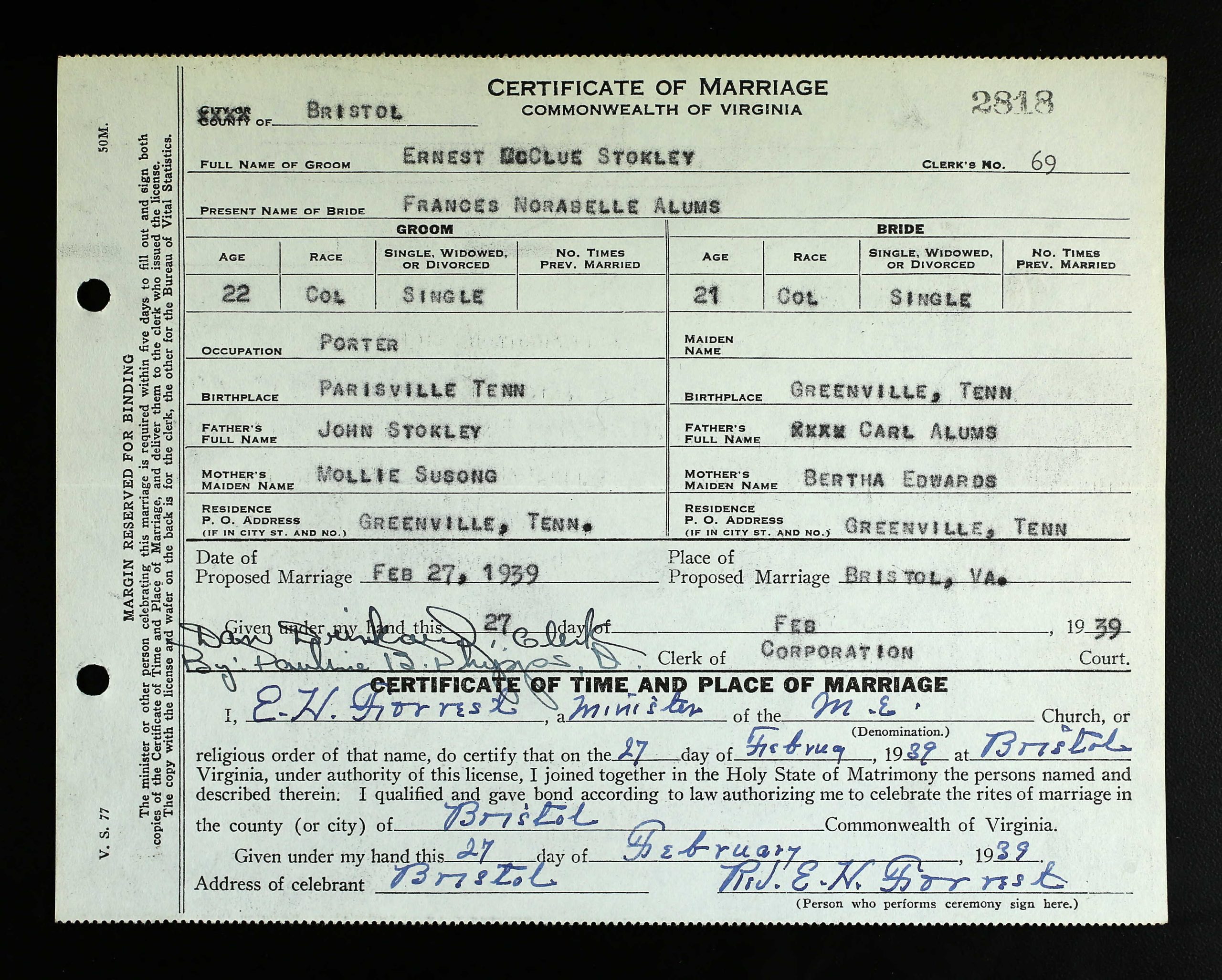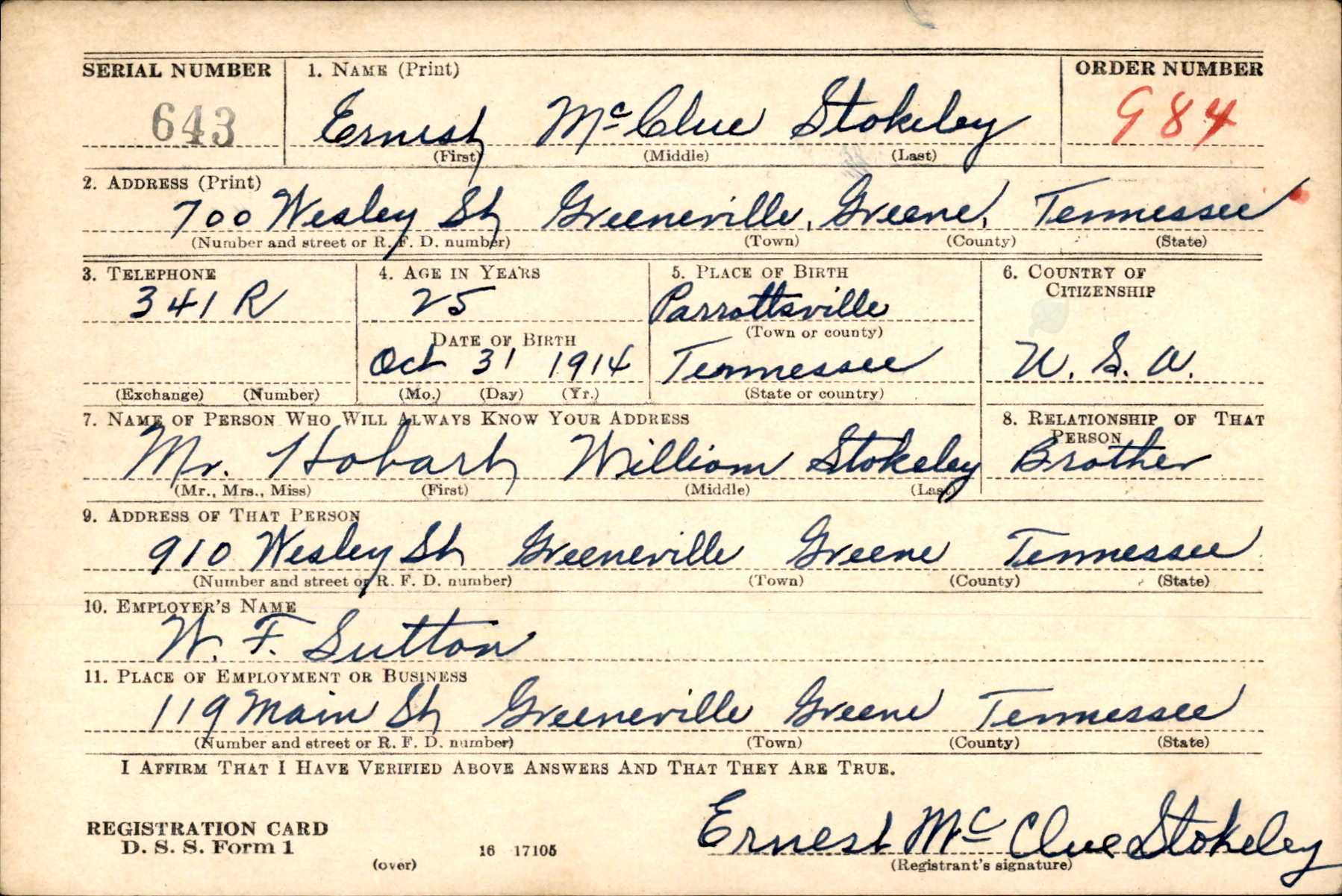 Ernest McClure Stokley (also spelled as Stokely) was born on 31 October 1914 at Parrottsville, Tennessee. Husband of Frances Norabelle Alums and father of Lemuel Stokley.