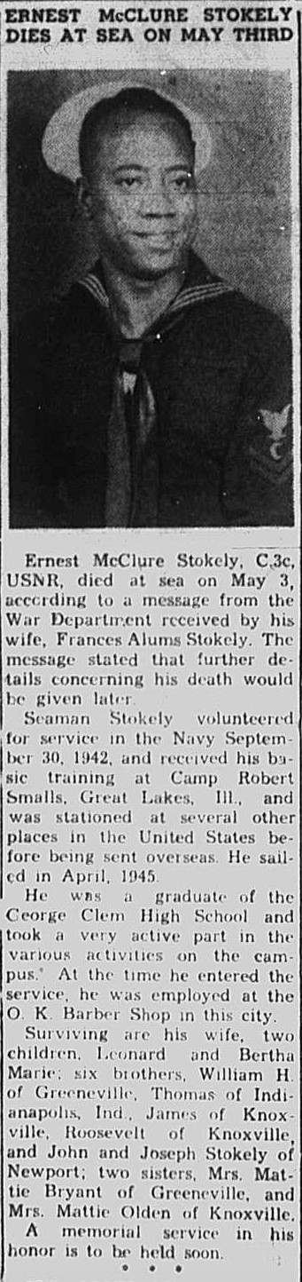Ernest McClure Stokely, C3c USNR, died at sea on May 3, according to a message from the War Department received by his wife, France Alums Stokely. The message stated that further details concerning his death would be given later. Seaman Stokely volunteered for service in the Navy September 30, 1942, and received his basic traning at Camp Robert Smalls, Great Lakes, Ill., and was stationed at several other places in the United States before being sent overseas. He sailed in April, 1945. He was a graduate of the George Clem High School and took a very active part in the various activities on the campus. At the time he entered the service, he was employed at the O.K. Barber Shop in this city. Surviving are his wife, two children, Leonard and Bertha Marie; six brothers, William H. of Greeneville, Thomas of Indianapolis, Ind., James of Knoxville, Roosevelt of Knoxville and John and Joseph Stokely of Newport; two sisters, Mrs. Mattie Bryant of Greeneville, and Mrs. Mattie Olden of Knoxville. A memorial service in his honor is to be held soon.