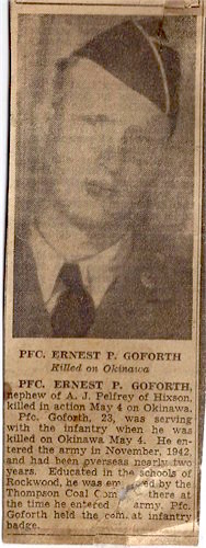 Ernest Paul Goforth was born 15 January 1920, the son of Paul Forest Goforth and Hattie Rector. He attended school in Rockkwood, Tenn., and entered army duty in November, 1942. He was overseas approximately two years. Holder of the Combat Infantry Badge, he was a former employee of the Thompson Coal Company in Rockwood.