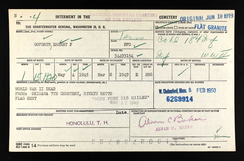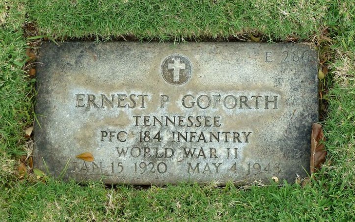 Private First Class Goforth was assigned to the 184th Infantry Regiment, 7th Infantry Division. He was killed in action on 4 May 1945. At that time, the 7th Infantry Division was engaged in the battle for Okinawa in the Ryukyu Islands. He is interred at E,0,286, Honolulu Memorial Cemetery, Hawaii.