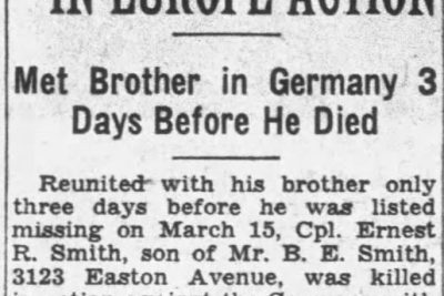 Reunited with his brother only three days before he was listed missing on March 15, Cpl. Ernest R. Smith, son of Mr. B.E. Smith, 3123 Easton Avenue, was killed in action against the Germans with an infantry unit on that date, the War Department informed his father yesterday. Cpl. Smith and his brother, Sgt. Willard Smith, spent several hours together in Germany soon after Cpl. Smith had gone to the front. It was their first meeting in more than two years. A graduate of Central High School, Cpl. Smith, 28, was employed at the Combustion Engineering Company prior to entering army duty in March, 1943. He received training with an army air force ground crew until he was transferred to the 94th Infantry Division (301 Regiment) in November, 1944. After six weeks infantry training, he was assigned to overseas duty, arriving in Europe in February, 1945. He was immediately assigned to combat duty, relatives said.