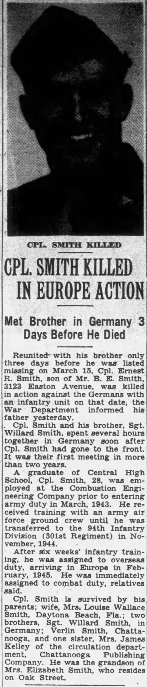 Reunited with his brother only three days before he was listed missing on March 15, Cpl. Ernest R. Smith, son of Mr. B.E. Smith, 3123 Easton Avenue, was killed in action against the Germans with an infantry unit on that date, the War Department informed his father yesterday. Cpl. Smith and his brother, Sgt. Willard Smith, spent several hours together in Germany soon after Cpl. Smith had gone to the front. It was their first meeting in more than two years. A graduate of Central High School, Cpl. Smith, 28, was employed at the Combustion Engineering Company prior to entering army duty in March, 1943. He received training with an army air force ground crew until he was transferred to the 94th Infantry Division (301 Regiment) in November, 1944. After six weeks infantry training, he was assigned to overseas duty, arriving in Europe in February, 1945. He was immediately assigned to combat duty, relatives said.