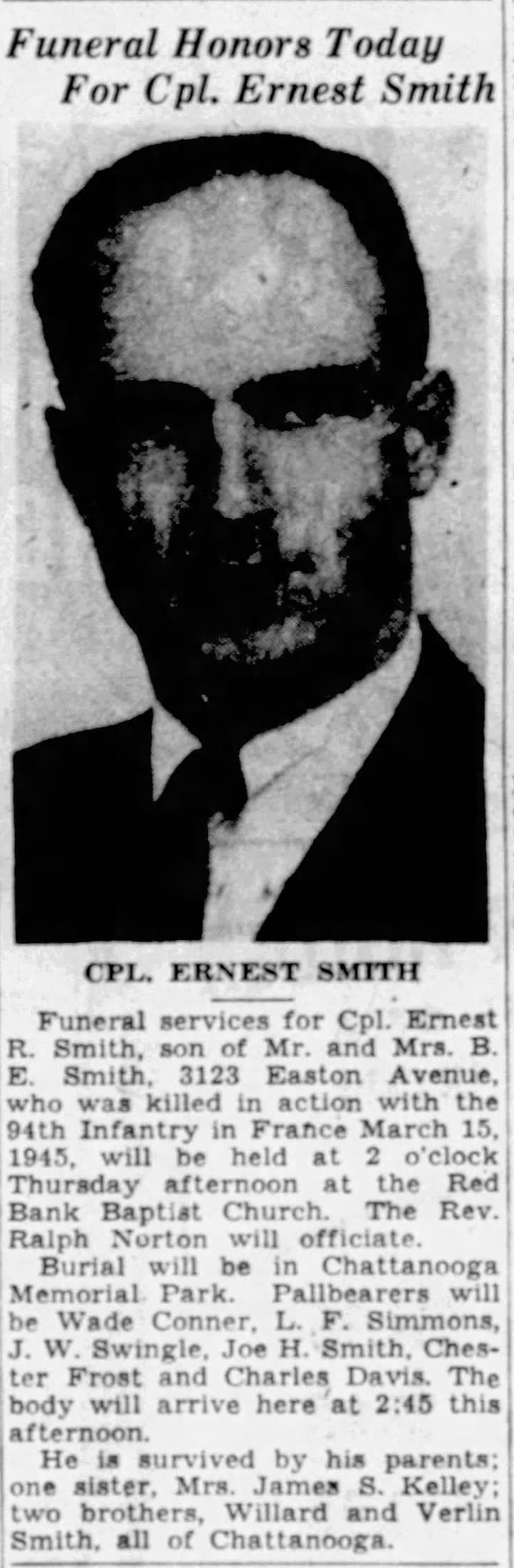 Cpl. Smith is survived by his parents; wife, Mrs. Louise Wallace Smith, Daytona Beach, Fla.; two brothers, Sgt. Willard Smith in Germany; Verlin Smith, Chattanooga and one sister, Mrs. James Kelley of the circulation department, Chattanooga Publishing Company. He was the grandson of Mrs. Elizabeth Smith, who resides on Oak Street.