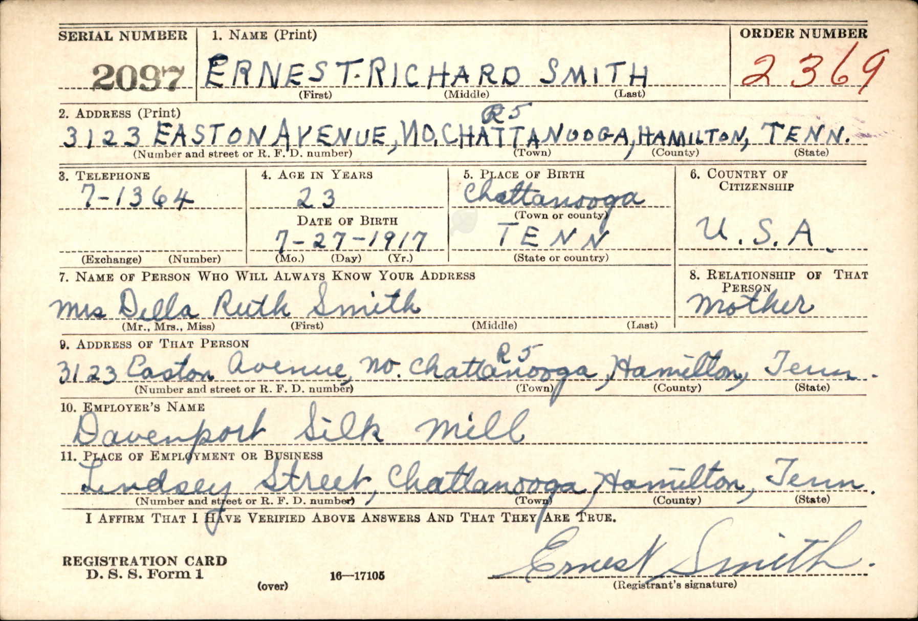 Ernest Richard Smith was born on 27 July 1917 at Chattanooga, Tennessee