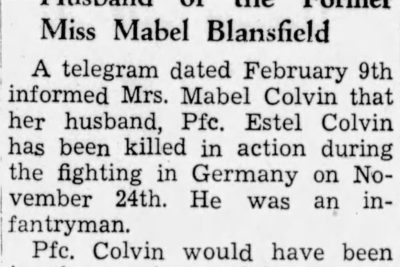 Estle Lee Colvin was born in 1912, the son of Jess Colvin and Martha Jane Gray. He married Mabel Gertrude Blansfield in 1940 at St. Brigid Church in New York. The couple were the parents of Laurie J. Colvin.