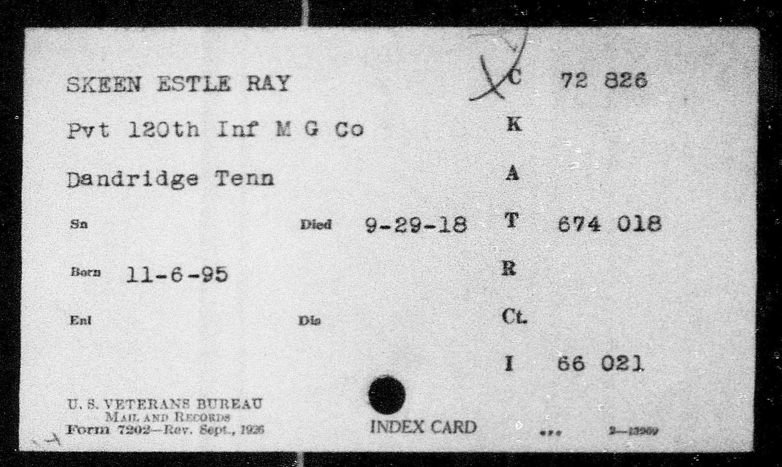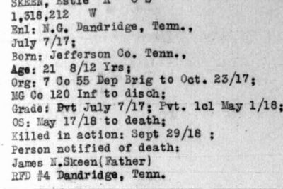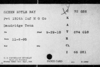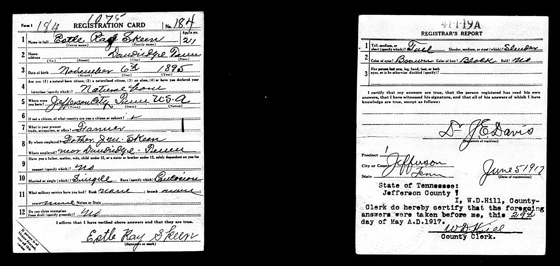 Estle Ray Skeen was born 6 November 1895 in Jefferson County, Tennessee to James Martin Skeen and Mintie Bell Barbee