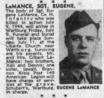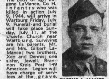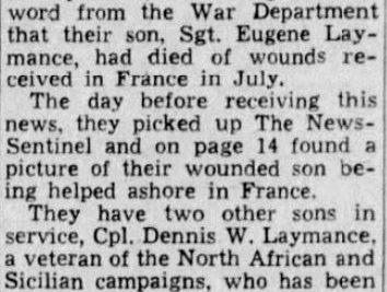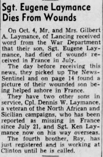 On Oct. 4, Mr. and Mrs. Gilbert A. Laymance, of Lancing received word from the War Department that their son, Sgt. Eugene Laymance, had died of wounds received in France in July. The day before receiving this news, they picked up The News-Sentinel and on page 14 found a picture of their wounded son being helped ashore in France. They have two other sons in service, Cpl. Dennis W. Laymance, a veteran of the North African and Sicilian campaign, who has been reported missing in France since July 21, and Sgt. Ken Laymance now on his way overseas. The fourth brother, Ray, has just registered and is working at Clinton until he is called.