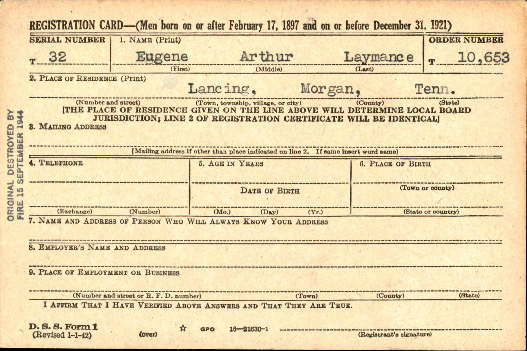 Eugene Arthur Laymance was the son of Gilbert Walter Laymance and Rachel Alice Jones. Sgt Laymance enlisted on 14 October 1942 at Georgia. He served with Company A, 329th Infantry. He Died of wounds in France. He is buried in Tennessee.