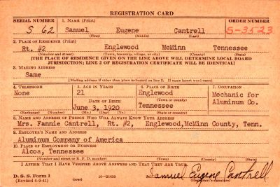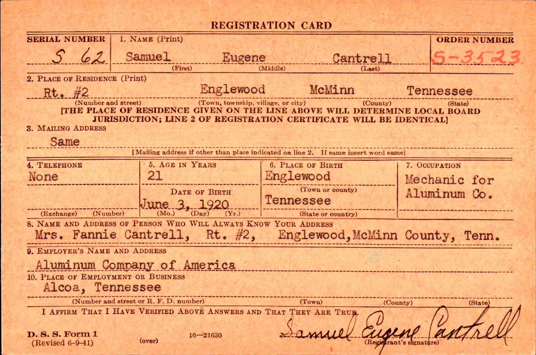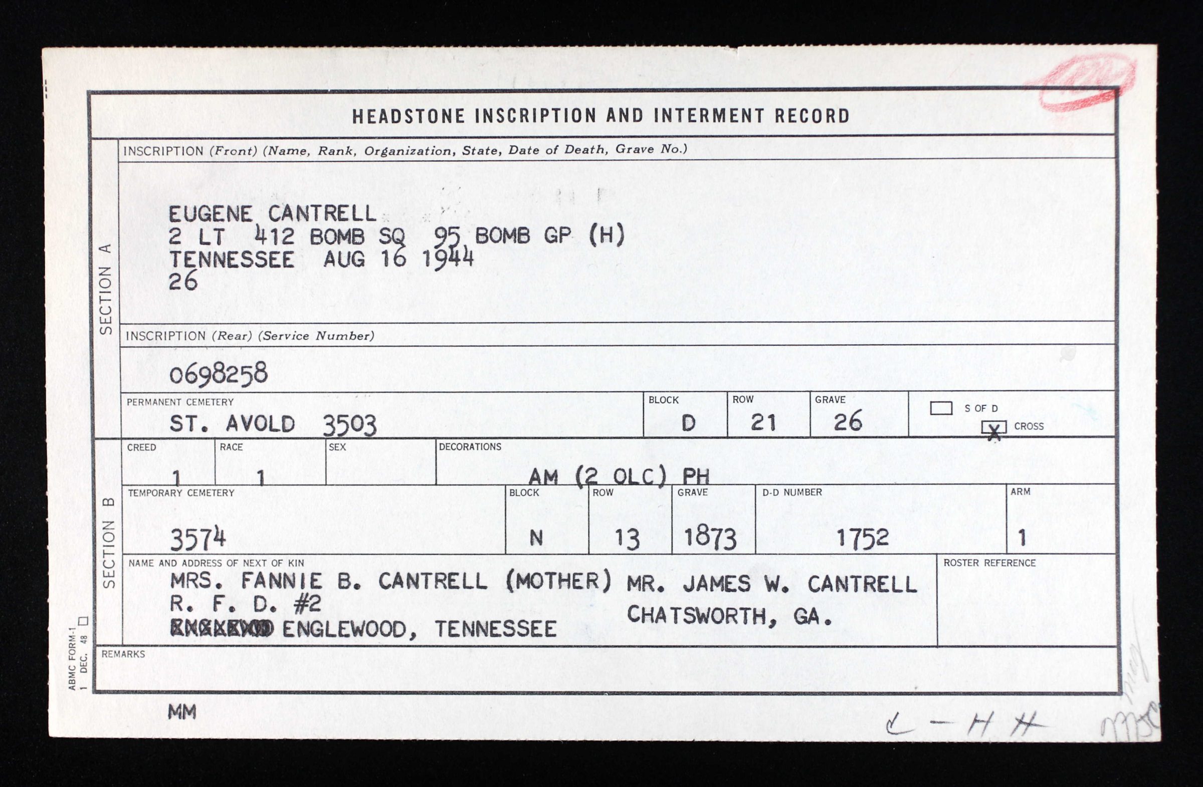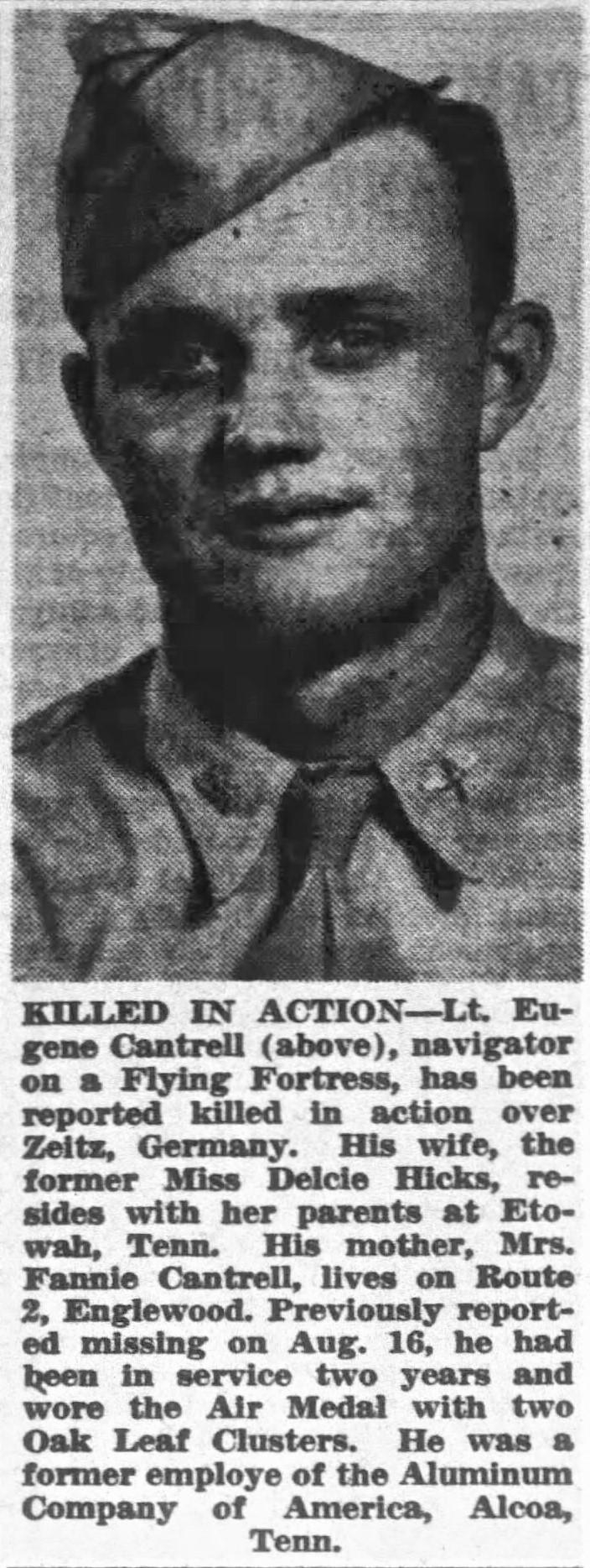 Lt. Eugene Cantrell, navigator on a Flying Fortress, has been reported killed in action over Zeitz, Germany. His wife, the former Miss Delcie Hicks, resides with her parents at Etowah, Tenn. His mother, Mrs. Fannie Cantrell, lives on Route 2, Englewood. Previously reported missing on Aug. 16, he had been in service two years and wore the Air Medal with two Oak Leaf Clusters. He was a former employe of the Aluminum Company of America, Alcoa, Tenn.