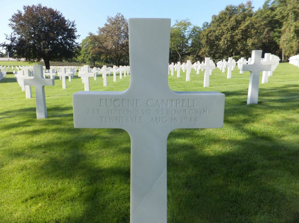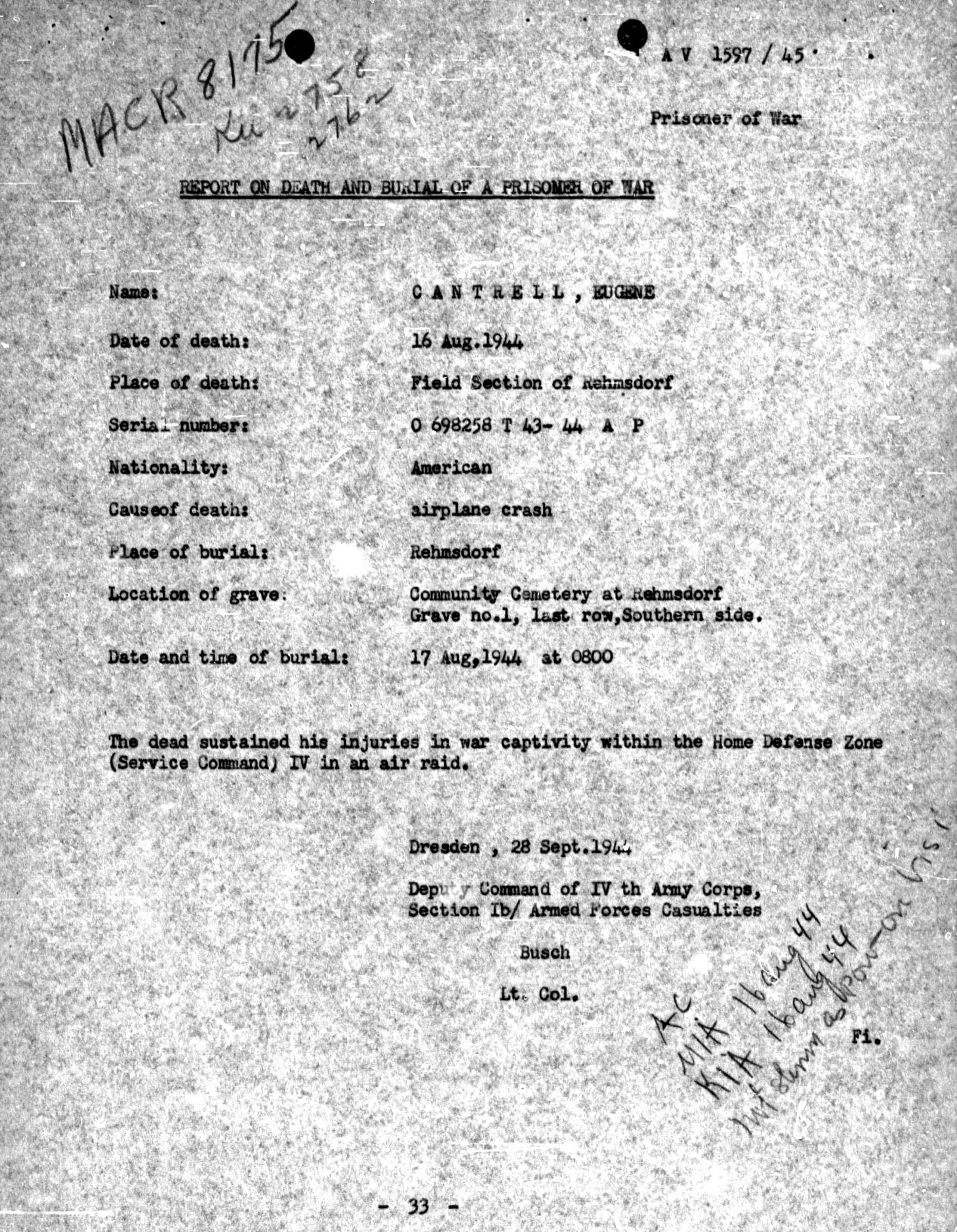 On 16 August 1944, aircraft B-17G, serial number 42-97797 was on a bombing mission to Zeitz, Germany. It received a direct hit by flak in the right wing, over the target of Zeitz, Germany at 1133 hours. There was an explosion near #3 engine which knocked most of the right wing off. The aircraft slipped out of formation and about a minute later the aircraft was seen to disintegrate in the air. Four chutes were reported as having left the aircraft. Aircraft 42-97797 crashed at Field section of Rehmsdorf. Eugene Cantrell didn´t bail out and was initially buried on the Community Cemetery at Rehmsdorf, Grave No. 1, last row, Southern side on 17 August 1944 at 0800 hours.