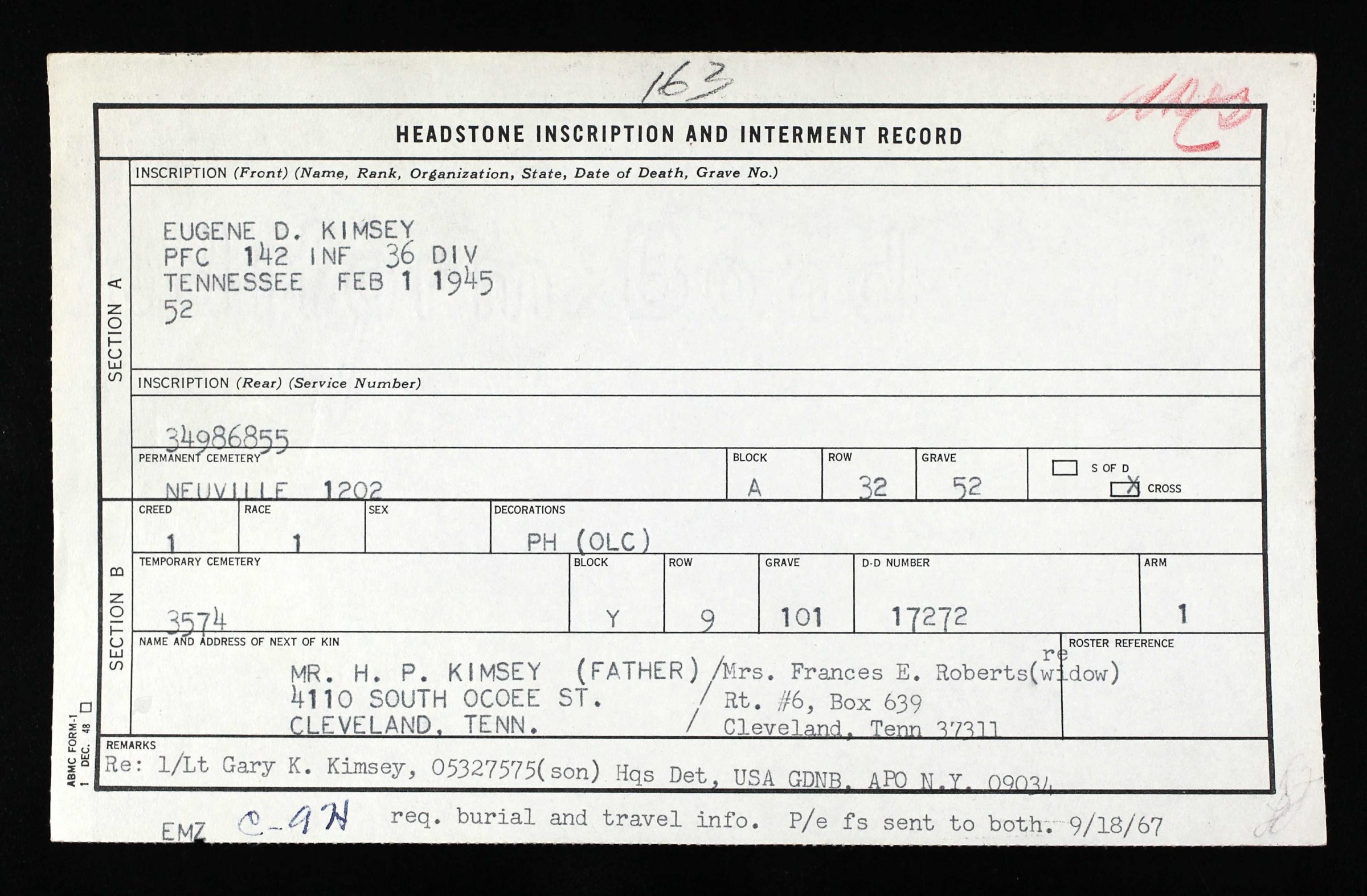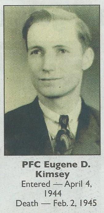 Eugene Kimsey was initially buried at Saint Avold Cemetery at Metz, France and reburied at Ardennes American Cemetery, Neupré, Belgium, A, 32, 52