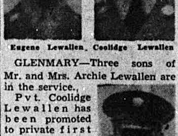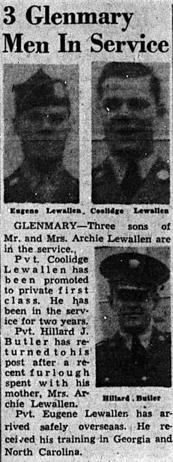 Glenmary – Three sons of Mr. and Mrs. Archie Lewallen are in the service. Pvt. Coolidge Lewallen has been promoted to private first class. He has been in the service for two years. Pvt. Hillard J. Butler has returned to his post after a recent furlough spent with his mother, Mrs. Archie Lewallen. Pvt. Eugene Lewallen has arrived safely overseas. He received his training in Georgia and North Carolina.