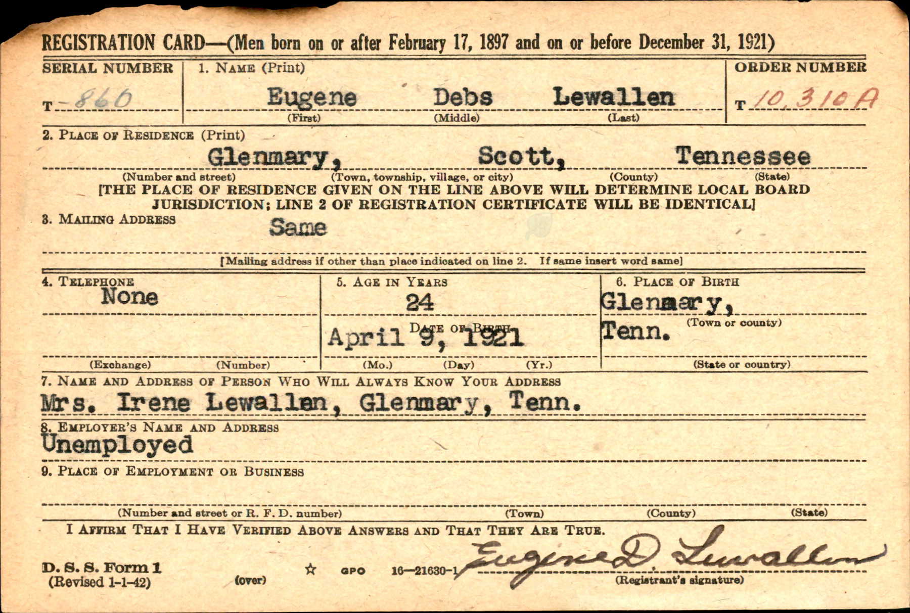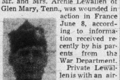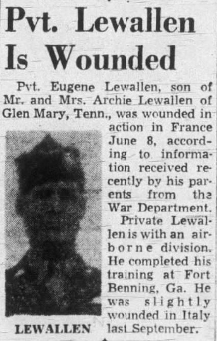 Pvt. Eugene Lewallen, son of Mr. and Mrs. Arcie Lewallen of Glen Mary, Tenn., was wounded in action in France June 8, according to information received recently by his parents from the War Department. Private Lewallen is with an airborne division. He completed training at Fort Benning, Ga. He was slightly wounded in Italy last September.