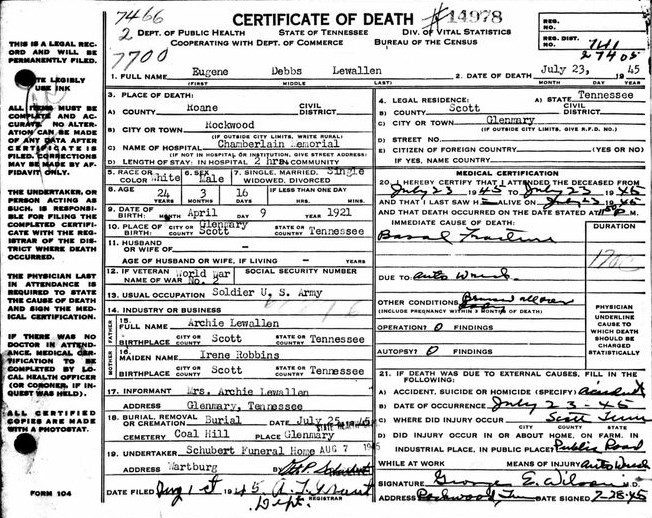 He died of his injuries at Chamberlain Memorial Hospital at Rockwood, Roane County in Tennessee caused by an car accident on the public road. He was the son of Archie Lewallen and Irene Robbins.