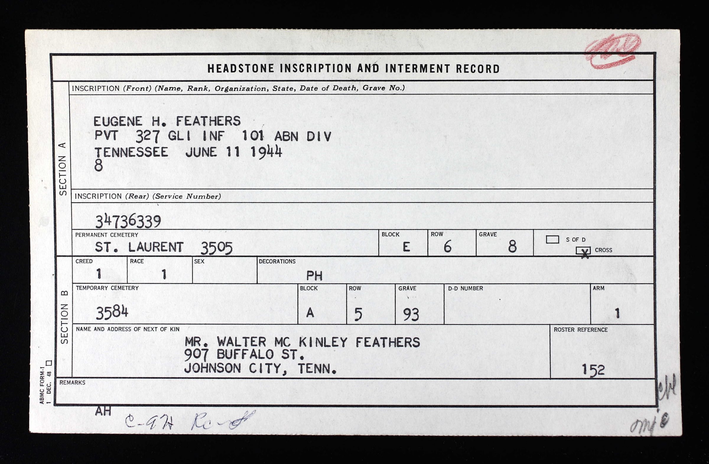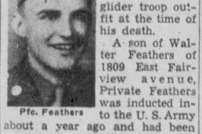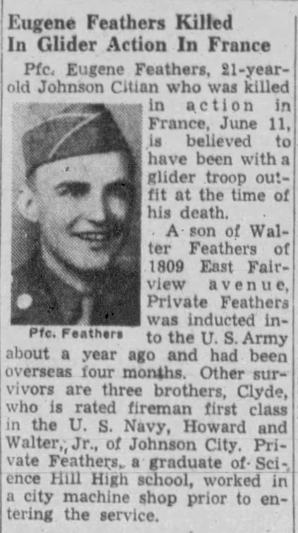 Pfc. Eugene Feathers, 21-year-old Johnson Citian who was killed in action in France June 11, is believed to have been with a glider troop outfit at the time of his death. A son of Walter Feathers of 1809 East Fairview avenue, Private Feathers was inducted into the U.S. Army about a year ago and had been overseas four months. Other survivors are three brothers, Clyde, who is rated fireman first class in the U.S. Navy, Howard and Walter Jr. of Johnson City. Private Feathers, a graduate of Science Hill High School, worked in a city machine shop prior to entering the service.