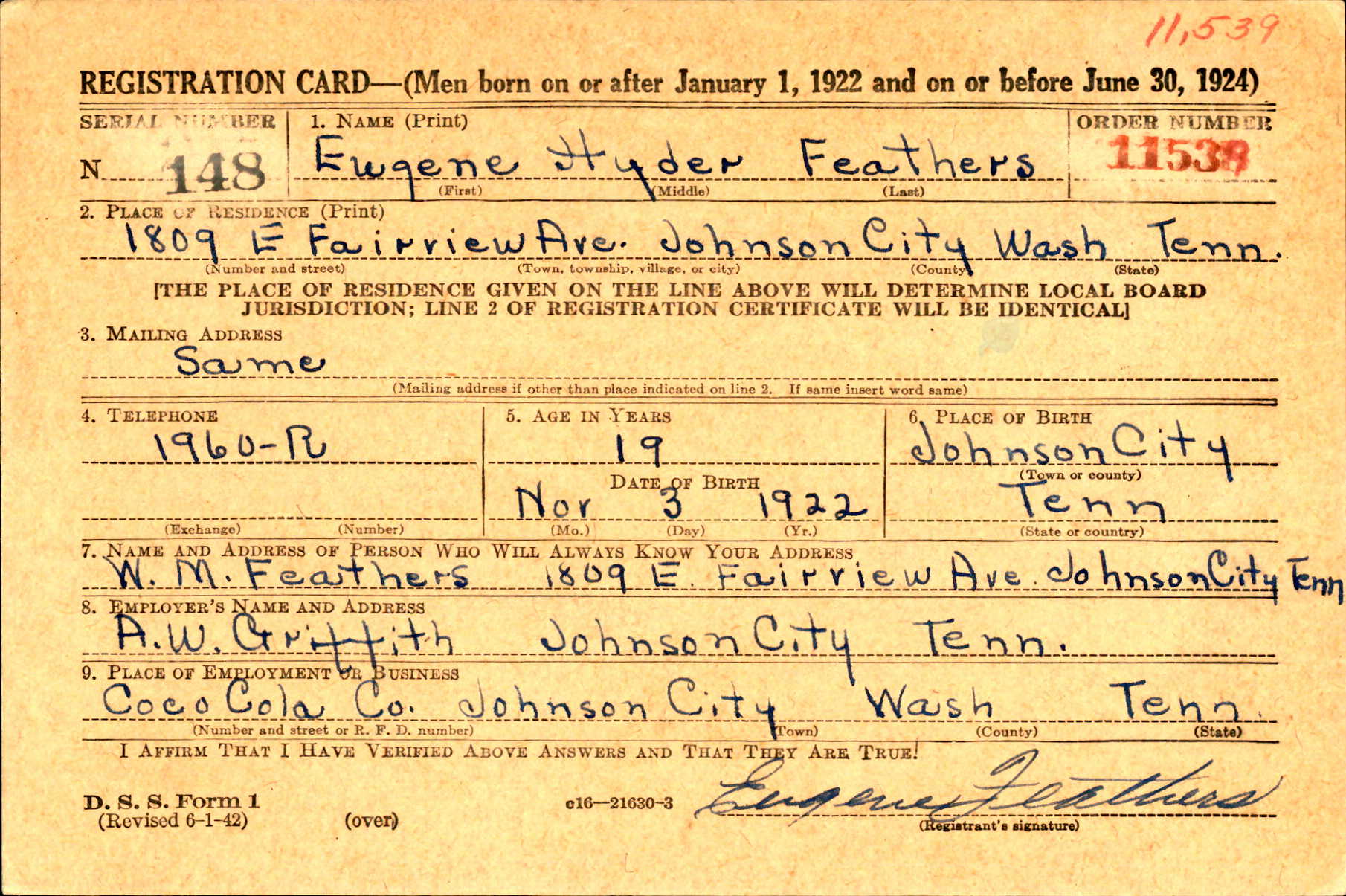 Eugene Hyder Feathers was born in Johnson City, Tennessee, the son of Walter McKinley Feathers and Margaret Lyle Leonard.