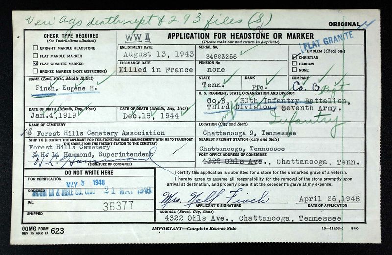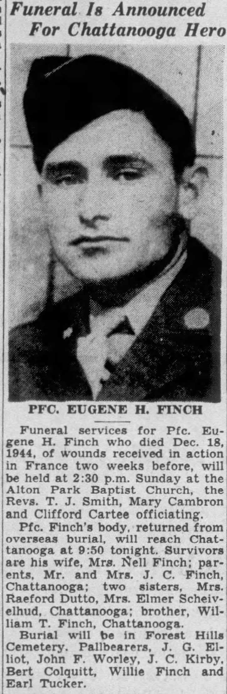 Previosly reported wounded in action in France Dec. 4, Pfc. Eugene H. Finch, husband of Mrs. Byndie N. Finch, 416 South Seminole Drive and son of Mr. and Mrs. J.C. Finch, 4332 Ohls Avenue died in that country Dec. 18 from wounds received in action with an infantry unit.