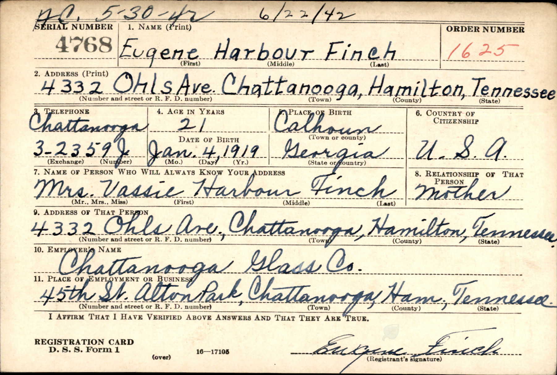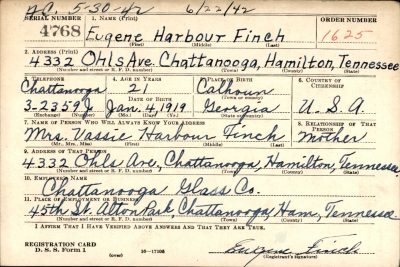Eugene Harbour Finch was born on 4 January 1919 at Calhoun, Georgia to James Columbus Finch and Byrdie Nell Finch.