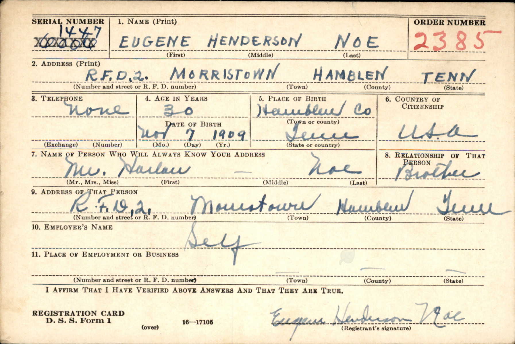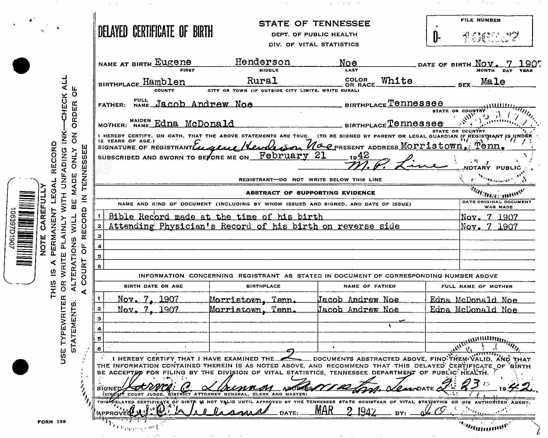 Eugene Henderson Noe was born on 7 November 1907, Rural, Hamblen County, Tennessee, the son of Jacob Andrew Noe and Edna McDonald.